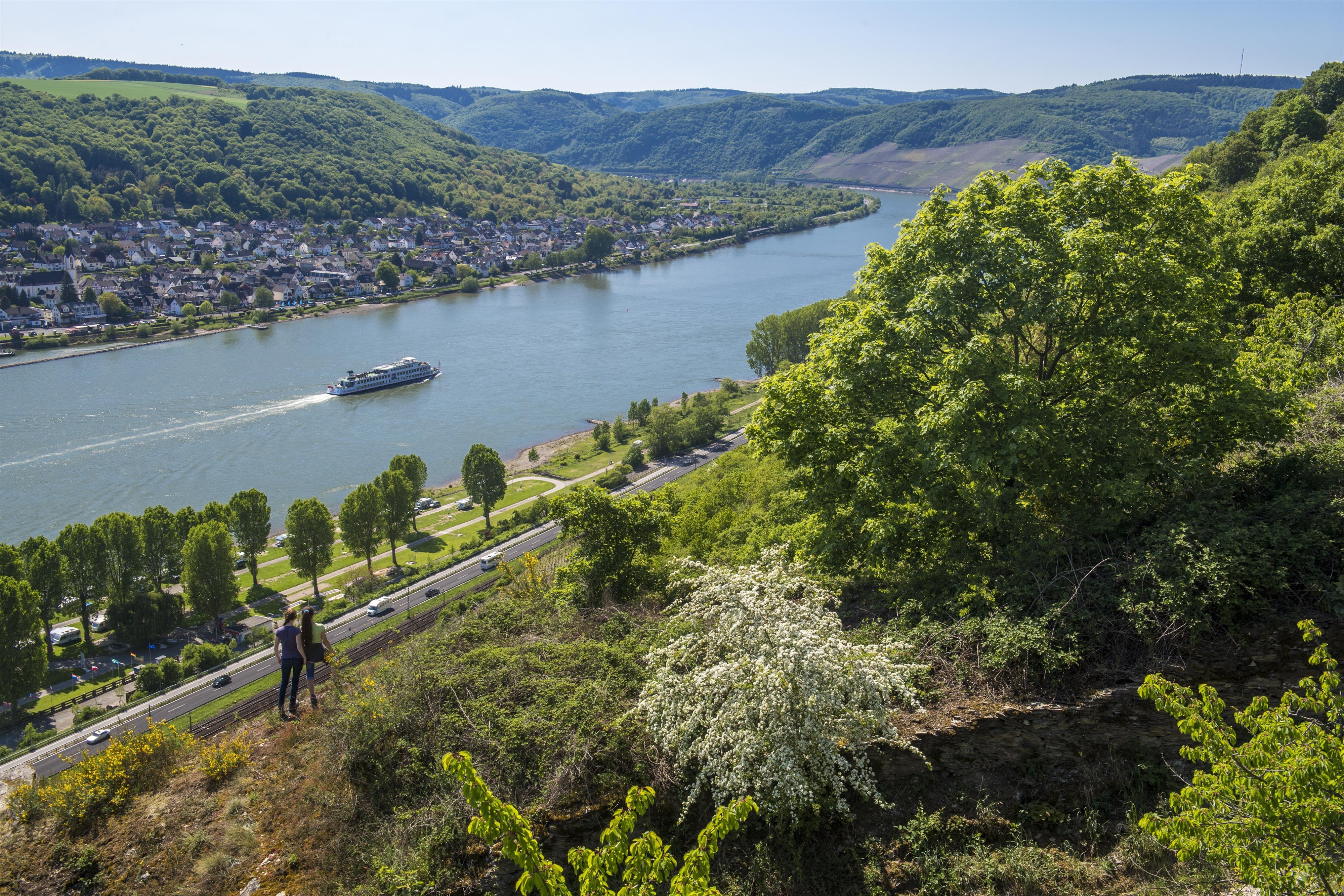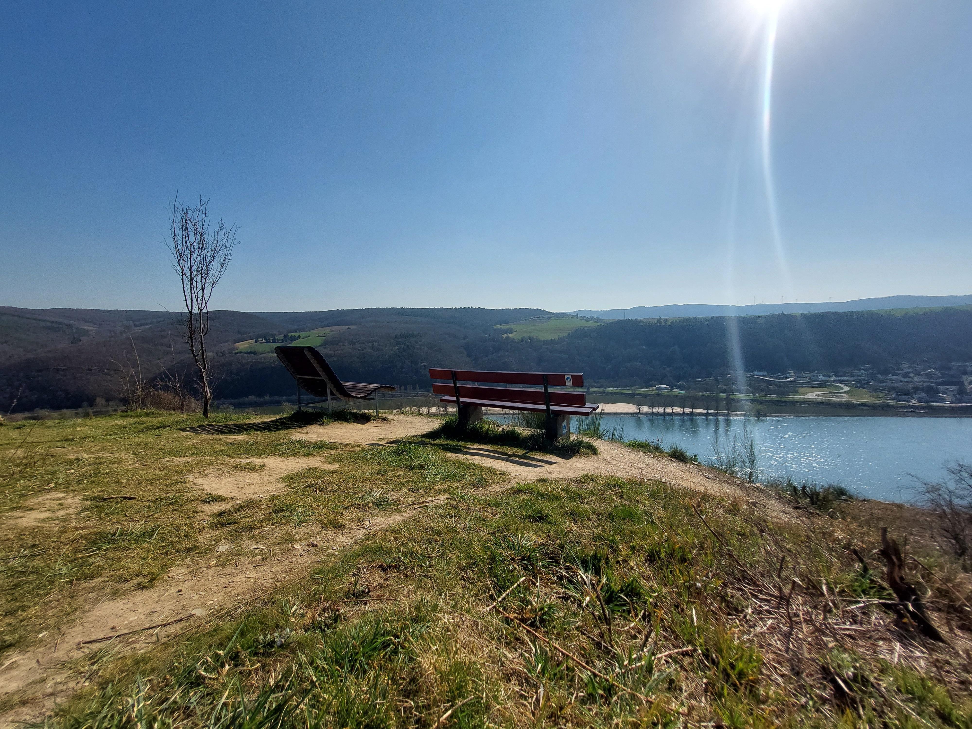 Dort befinden sich eine Sitzbank und eine Liegebank, die zu einer Rastpause mit fantastischen Aussichten in das Rheintal und auf die Steillagen des Bopparder Hamms einladen.