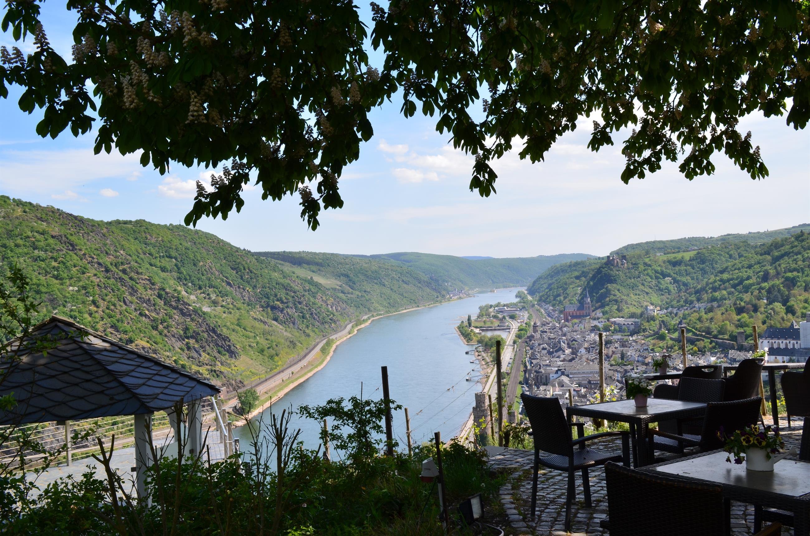 Grandioser Fernblick ins Rheintal, auf die Burgen Schönburg, Pfalzgrafenstein und Gutenfels sowie die Stadt Oberwesel. Bei Niedrigwasser tauchen, nach einer Sage, die Sieben Jungfrauen (Felsformation) aus dem Rhein auf. Parkplatz ca. 50 m entfernt. Direkt am RheinBurgenWanderweg gelegen.