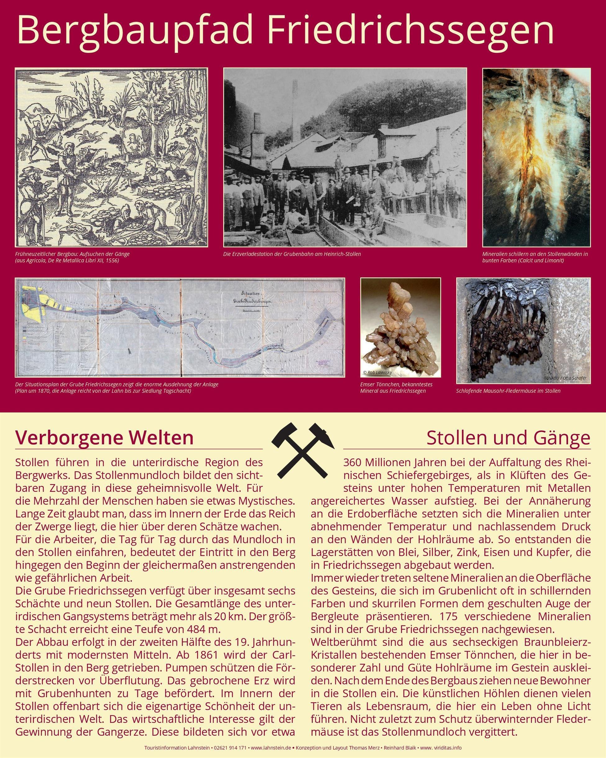 Im Innern der Stollen offenbart sich die eigenartige Schönheit der unterirdischen Welt. Das wirtschaftliche Interesse gilt der Gewinnung der Gangerze. Diese bildeten sich vor etwa 360 Millionen Jahren bei der Auffaltung des Rheinischen Schiefergebirges, als in Klüften des Gesteins unter hohen Temperaturen mit Metallen angereichertes Wasser aufstieg. Bei der nachfolgende Abkühlung setzten sie die Mineralien an den Wänden der Hohlräume ab. So entstanden die Lagerstätten von Blei, Silber, Zink, Eisen und Kupfer, die in Friedrichssegen abgebaut werden.