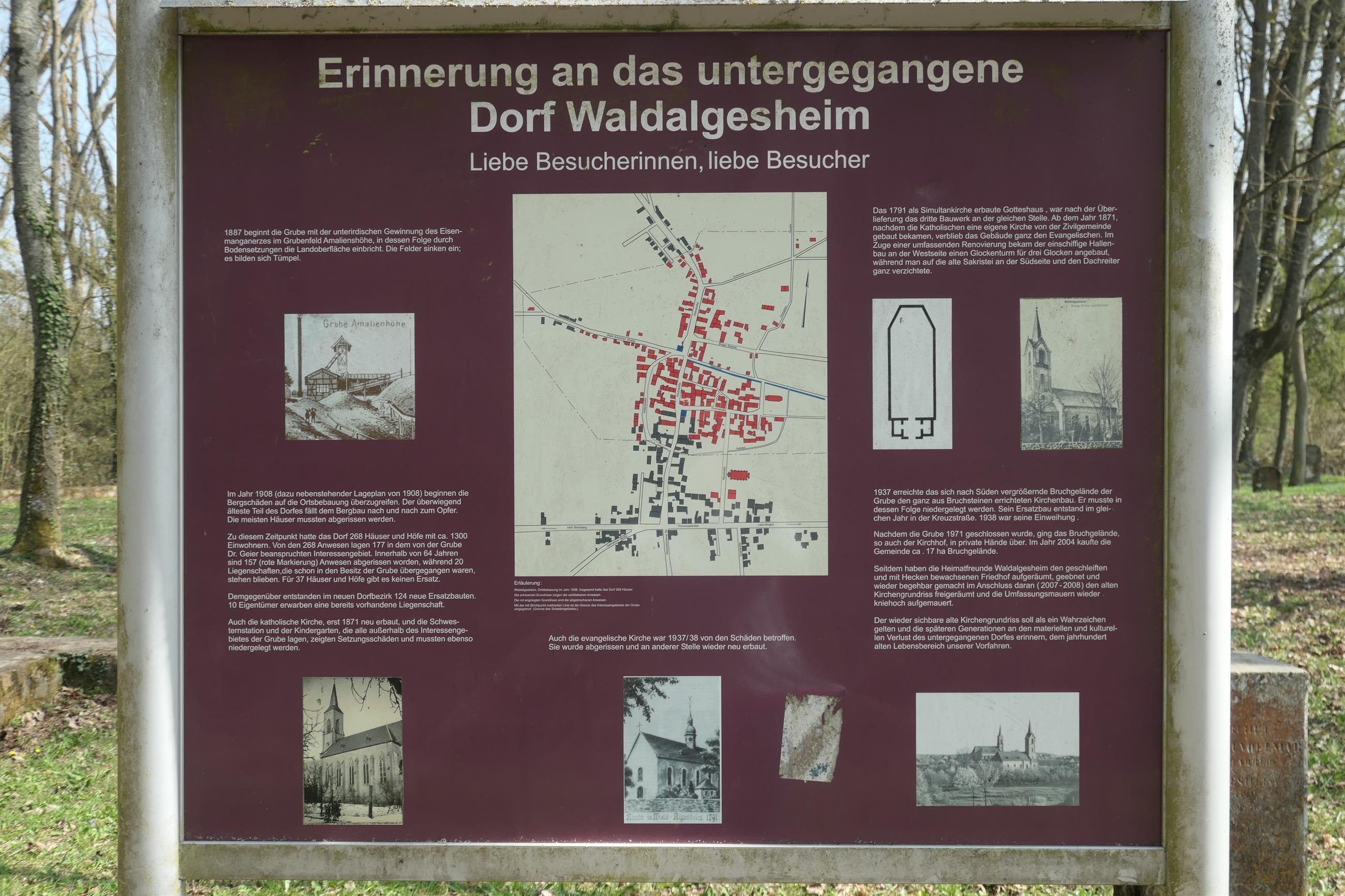 Der wieder sichtbare Kirchengrundriss erinnert an die Historie der Schäden durch Bergsenkungen und dient heute als Wahrzeichen des „untergegangenen“ Dorfes. Die Grünanlage befindet sich an der Neustraße nördlich der Keltenhalle. In Folge der Gewinnung des Eisenmanganerzes im nördlich gelegenen Grubenfeld Amalienhöhe begannen Bergsenkungen ab 1908 auf die Ortsbebauung von Waldalgesheim überzugreifen. Die Häuser des überwiegend ältesten Teils des Dorfes mußten abgerissen werden. Von den 1908 bestehenden 268 Häusern und Höfen lagen 177 in dem als Schadensgebiet anerkannten Grubengebiet. Bis in die 1970er Jahre wurden 157 Anwesen abgerissen. Für 37 Häuser und Höfe gab es keinen Ersatz. Im neuen Dorfbezirk entstanden 124 neue Ersatzbauten. Auch die katholische und die evangelische Kirche im Schadensgebiet respektive „Bruchgelände“ mussten abgerissen werden.