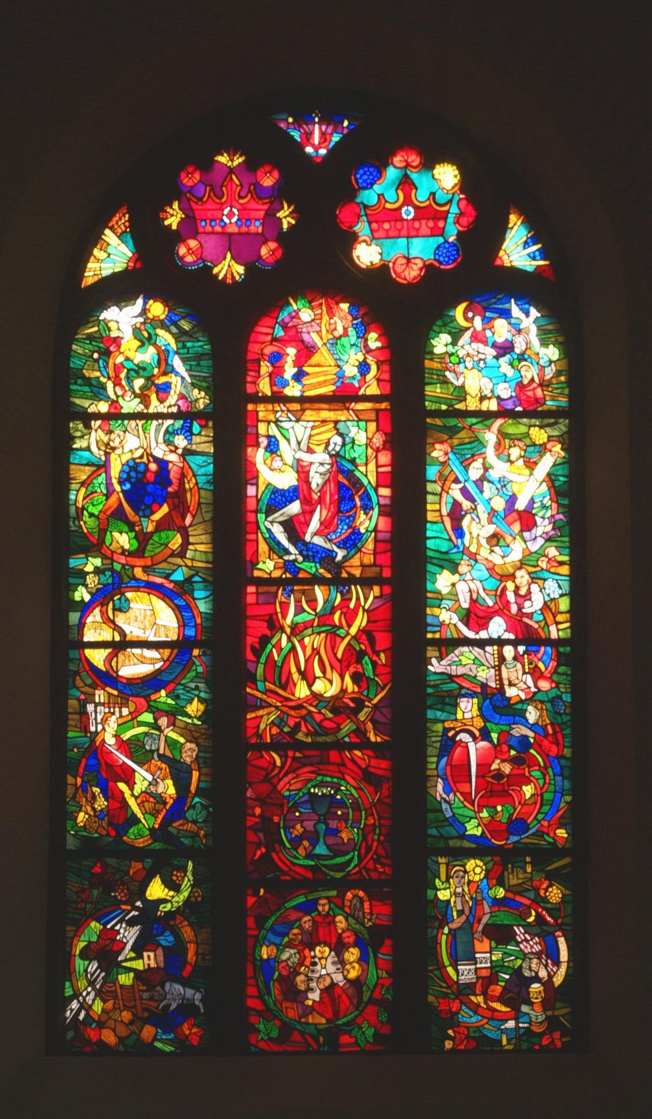 Sehenswert ist das Weinstockfenster aus dem Jahr 1968 mit biblischen Gleichnissen und Szenen über den Wein.