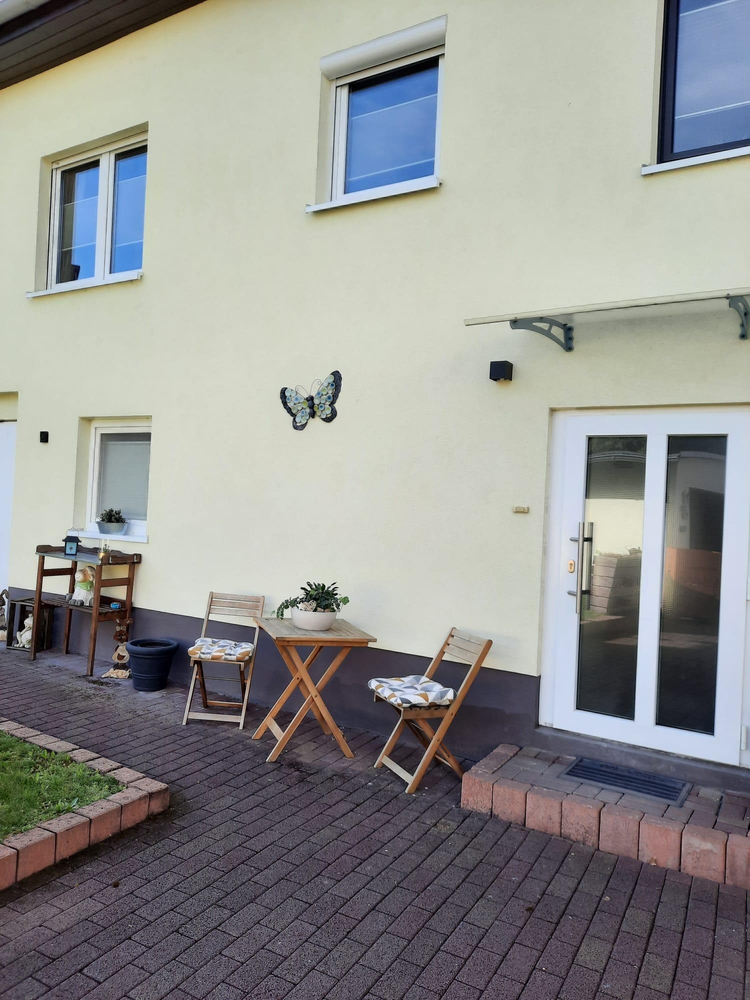 Vor dem Eingang zur Ferienwohnung finden Sie nach Ihrem Ausflug einen Platz zum Entspannen in unserem Garten.