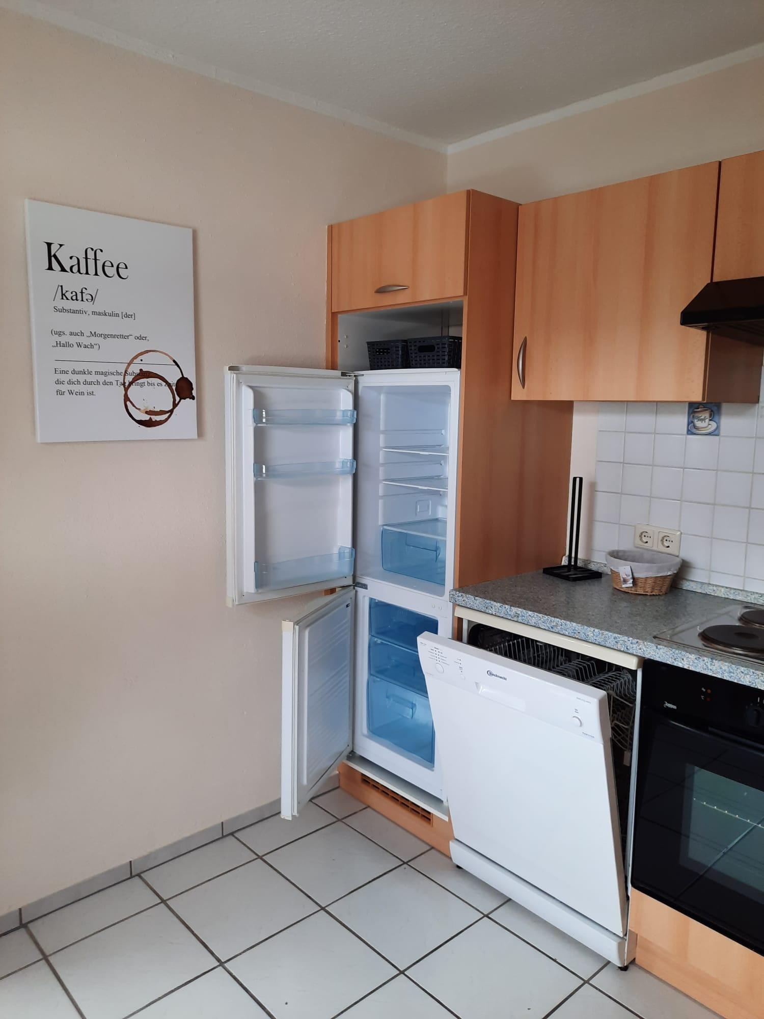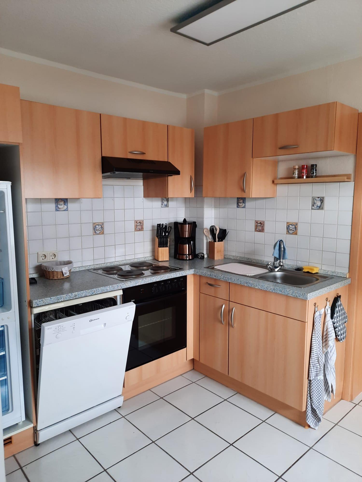 Die Küche ist mit Spülmaschine, Mikrowelle, Herd, Backofen und einer Kühl- Gefrier- Kombination ausgestattet. Selbstverständlich beinhaltet die Küche alle Elektrokleingeräte wie Kaffeemaschine, Toaster, Wasserkocher und Eierkocher.