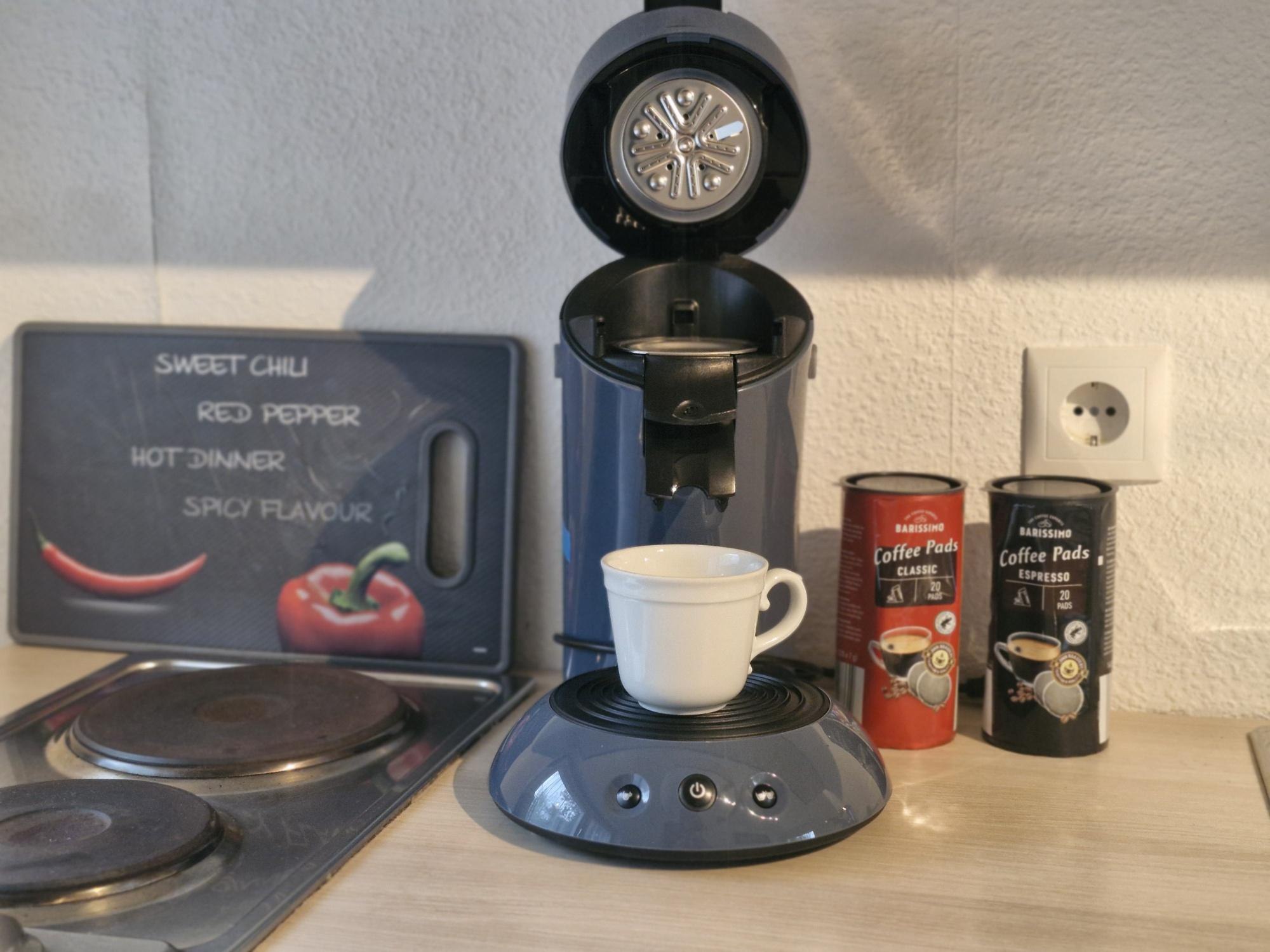 Der Wohnbereich besitzt eine kleine Küchenzeile mit Kühlschrank, Kaffeemaschine und Mini Backofen. Küchentücher sowie Spülmittel sind enthalten.