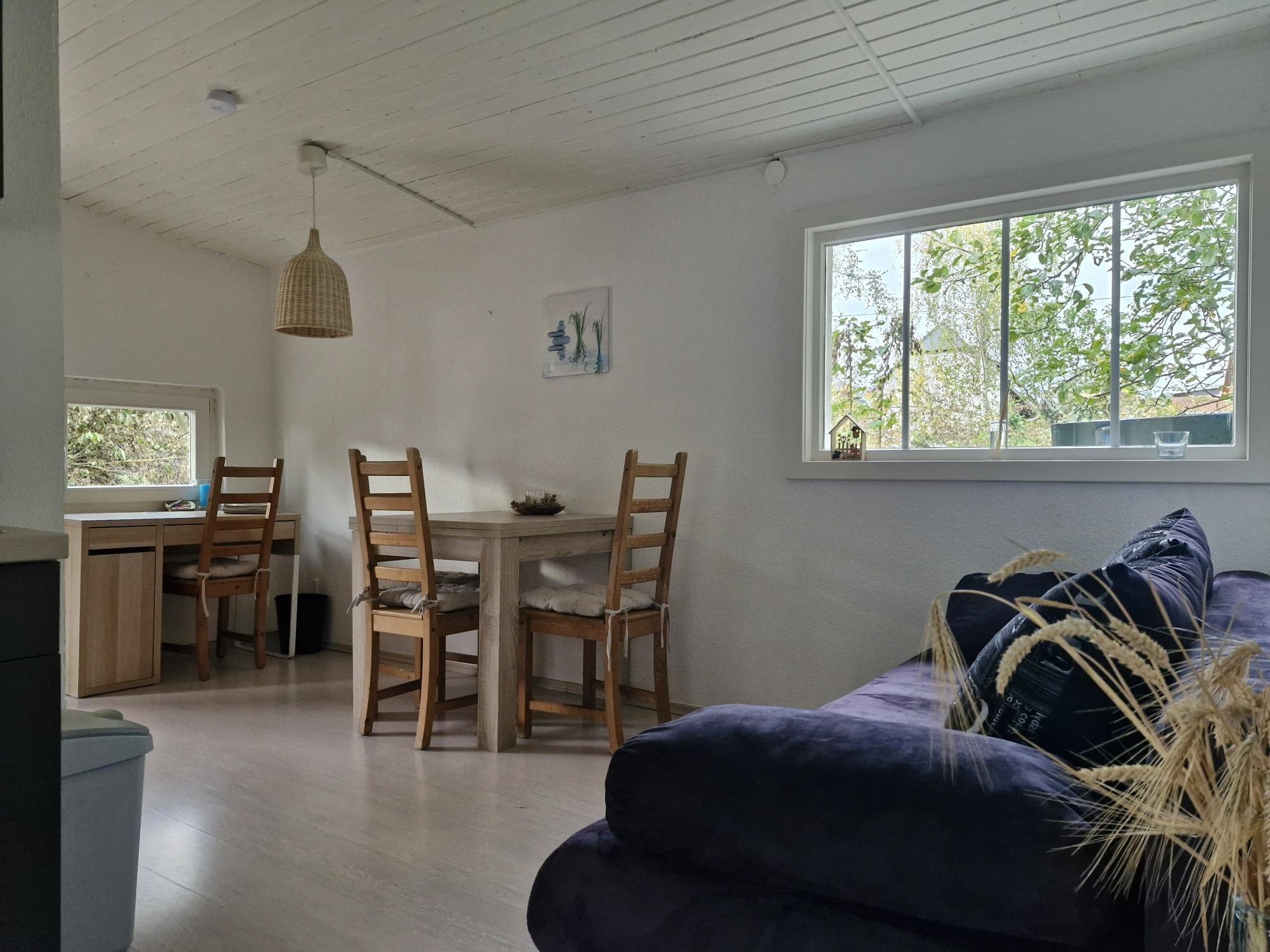 Das kleines, liebevoll eingerichtete Häuschen liegt im Hinterhof mitten im Grünen und ist ca. 25qm groß. Das Haus ist ebenerdig bis auf 2 Stufen zum Schlafbereich und verfügt über einen großen Wohn-Essbereich mit Schlafcouch sowie ein großes separates Schlafzimmer. Das Häuschen ist für 2 bis maximal 3 Gäste ausgelegt.