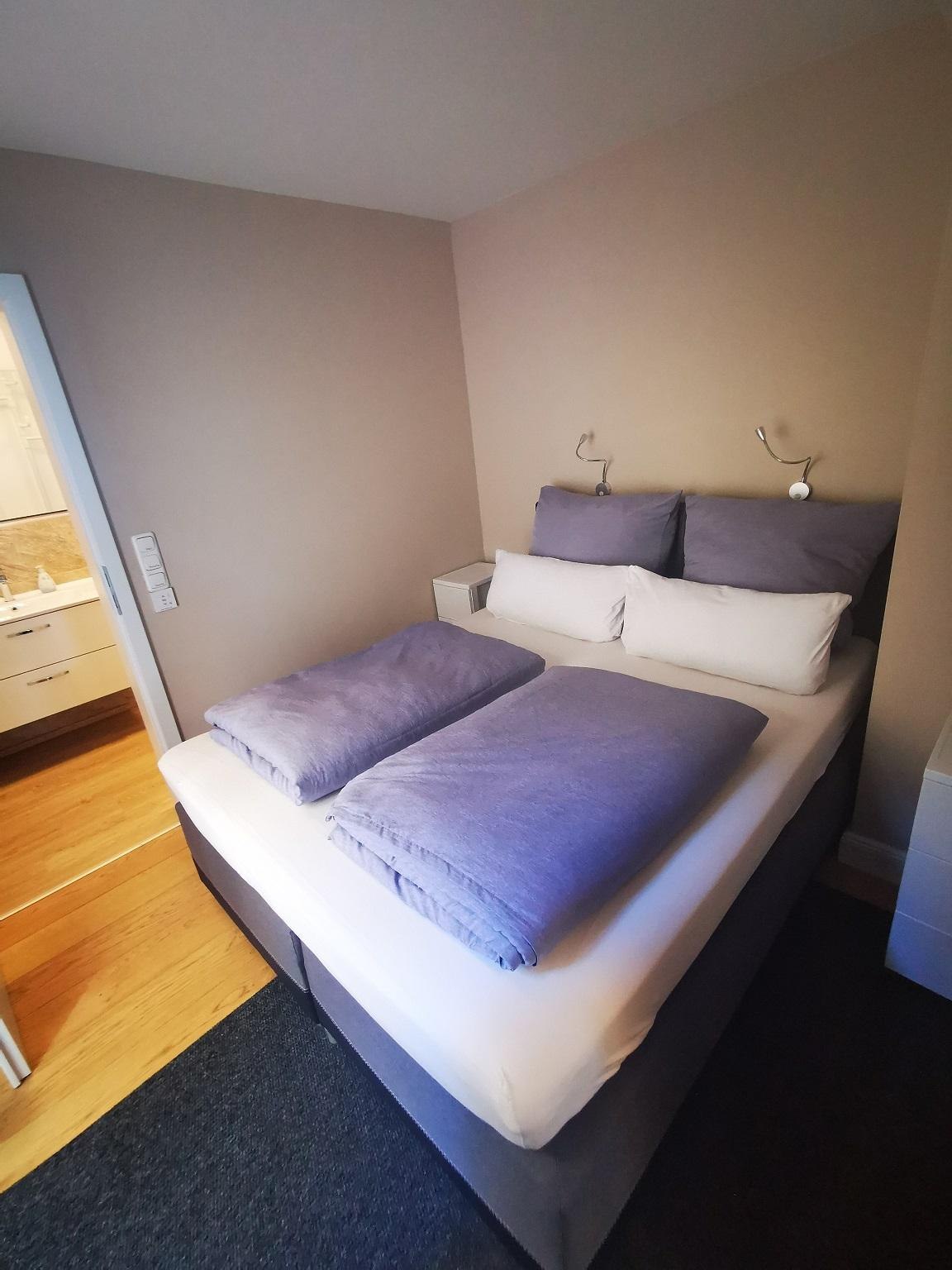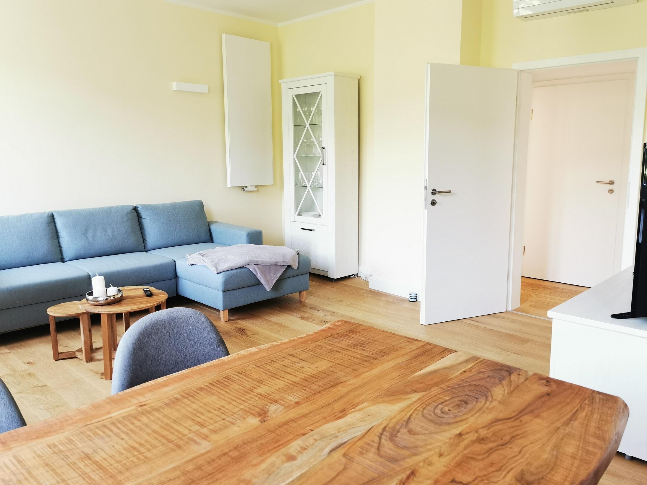 Wohnungsausstattung im 2.OG (ca. 60 qm mit Minibalkon) - Wohnraum mit Einbauküche, Eßplatzbereich, Wohnbereich (auch als Schlafcouch verwendbar), - Flur (keine Durchgangszimmer) - ein Schlafzimmer m. Balkon, - Bad Kurz-Beschreibung: Doppelbett (2 x 90x200cm) + Gäste-Schlafcouch im Wohnzimmer 120x200 cm + Kinderbettchen, Bad m. Dusche/WC (Fön und Hygieneartikel), Esstisch mit bequemen Stühlen Sitzgelegenheit, Telefon (auf Wunsch mit eigener Telefonnummer - nur Festnetz). Große Smart TV`s mit Magenta TV, Amazon Prime und Waipu TV in Wohn-u. Schlafzimmer, W-LAN und LAN-Anschlüsse