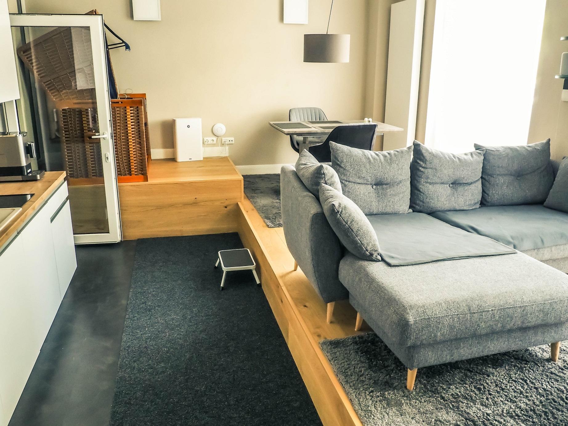Wohnungsausstattung im 3.OG (ca. 120 qm mit Loggia) im Maisonettestil 3./4.OG - Wohnraum/Wohnbereich ca. 40 qm mit großen Esstisch für 8 Personen, separate Küche (vom Wohnraum aus zu betreten), WC. Im darüberliegenden Stockwerk (innenliegende Privattreppe) befinden sich 2 Schlafzimmer mit Doppelbetten sowie ein weiteres Schlafzimmer mit 2 Einzelbetten, großes Bad (Dusche u. Wanne) und ein getrenntes WC. Diese Wohnung eignet sich optimal für größere Familien oder zwei befreundete Paare. 2 x Doppelbetten (2 x 80x200cm) + 2 x Einzelbetten 100x200 cm + Kinderbettchen Bad m. Dusche/Wanne WC (Fön und Hygieneartikel) + 2 x WC, extra Schreibtisch, TV mit Tcom Mediathek und Amazon Prime Video, LAN u. W-LAN (150 mbits/s), Waschmaschine und Trockner in der Wohnung