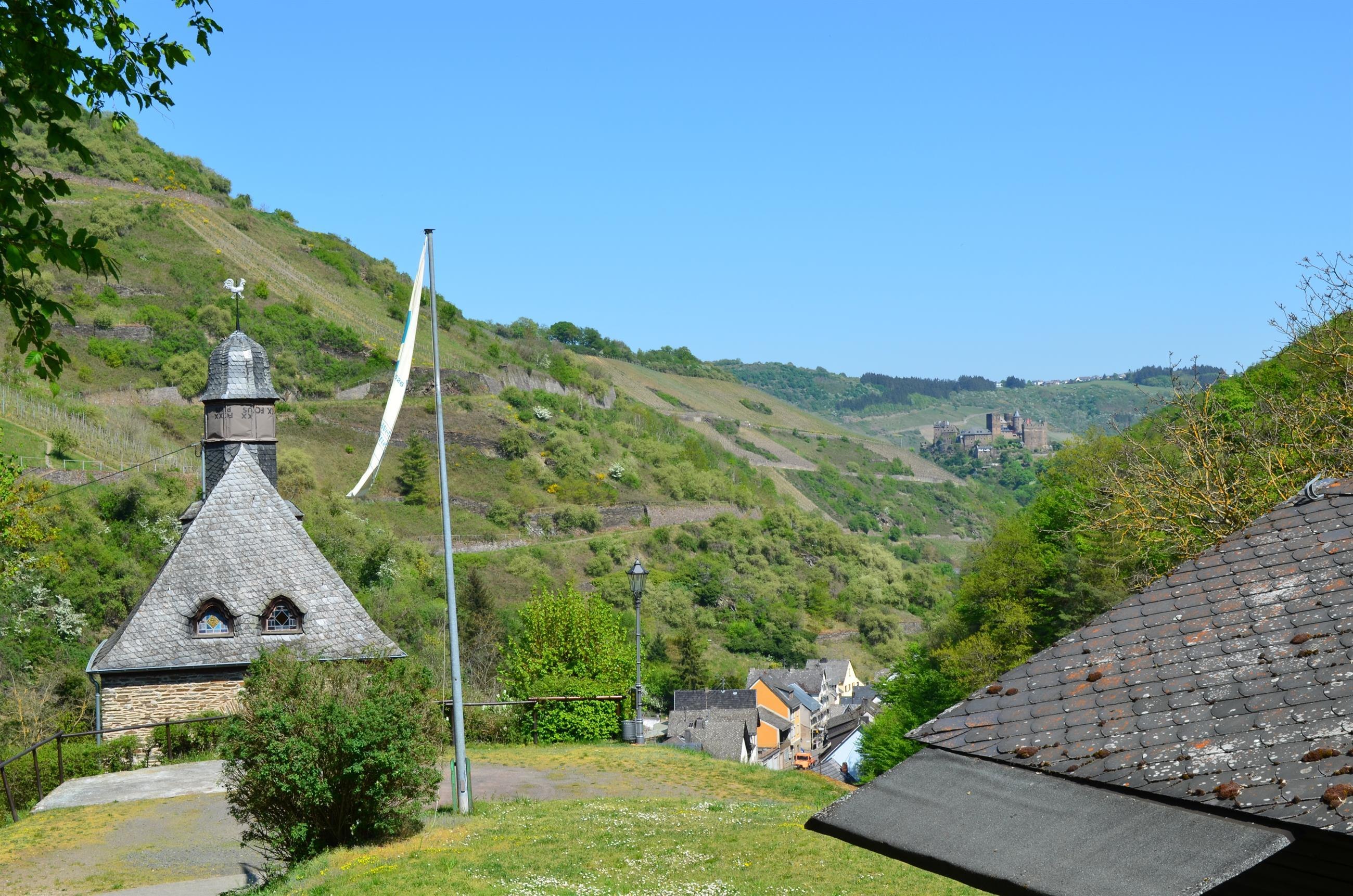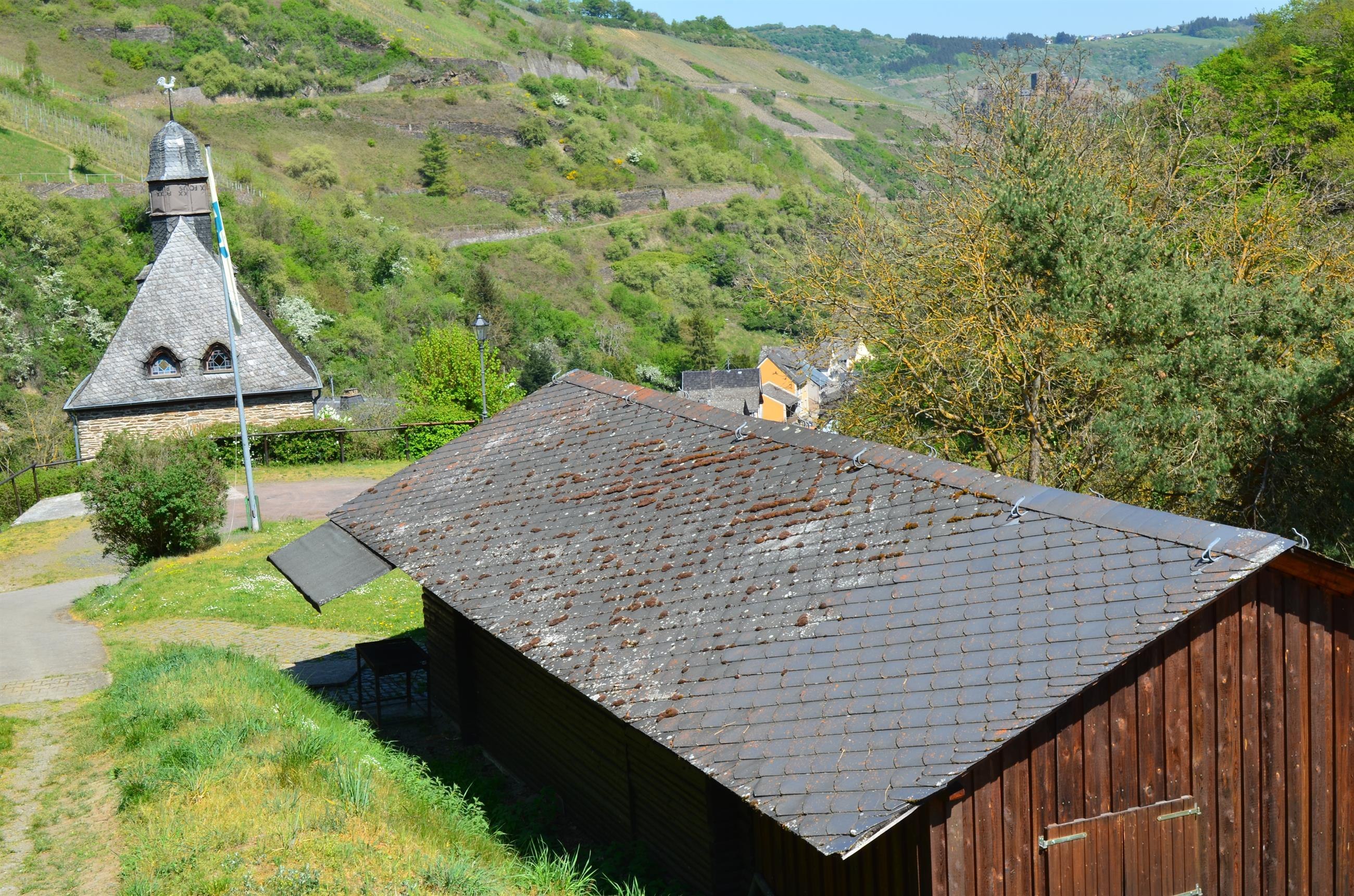 (Quelle: Wikipedia) Die kleine Kapelle zur Schmerzhaften Muttergottes hat seit langem den Status einer Katholischen Filialkirche. Sie wurde an Stelle einer barocken Vorgängerkapelle aus dem 17. Jahrhundert, die mitten im Dorf stand, nach deren Baufälligkeit und nach gewachsener Seelenzahl 1923/25 aus Bruchsteinen oberhalb der alten Dorfschule nach Plänen von Karl Hertzner aus Oberwesel erbaut. Sie ist ein kleiner neobarocker Saalbau mit je drei geschwungenen Fenstern auf den Seiten und je zwei sechseckigen im eingezogenen polygonalen Chorschluss, mit geschiefertem Walmdach, achteckigem Dachreiter und geschweifter Haube, Laterne, die von einem Wetterhahn bekrönt ist.