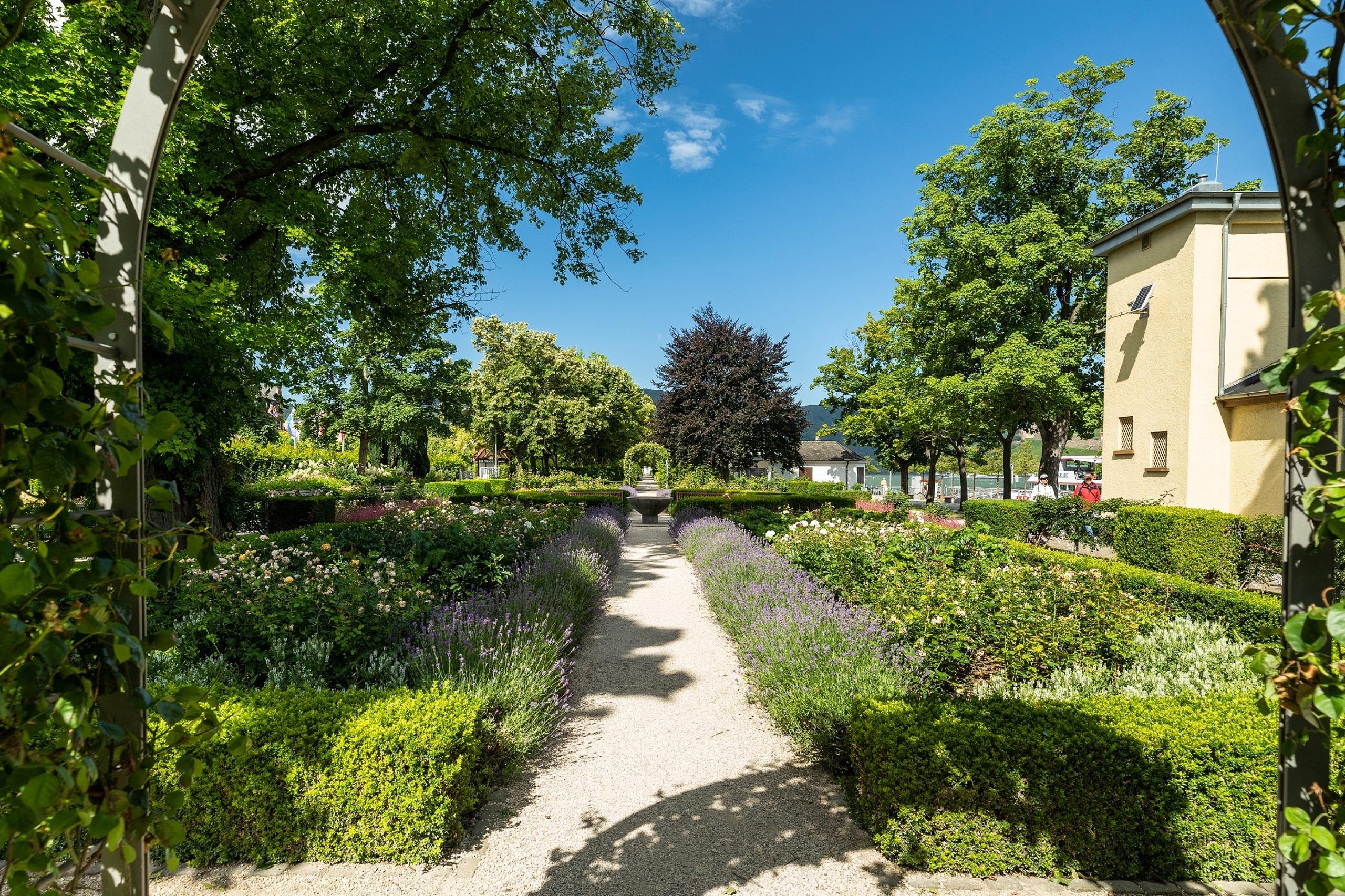 Nördlich der Binger Innenstadt, über der die Burg Klopp thront, liegt das Rheinufer, das im Rahmen der Landesgartenschau 2008 in das lebendige blühende „Kulturufer“ umgewandelt wurde. Der Spaziergänger auf der 3 km langen Uferpromenade wird begleitet von einem üppigen Blütenmeer auf der einen und traumhaften Aussichten auf der anderen Seite. Vom östlichen Ende bis zum Rhein-Nahe Eck bietet sich ein herrlicher Blick auf die Weinberge des Rheingaus mit der mächtigen Germania des Niederwalddenkmals bei Rüdesheim. Die Schiffsanleger sind der Startpunkt für Schiffsfahrten zur weltbekannten Loreley. Weiter gen Westen passiert der Weg das ehemalige Elektrizitätswerk der Stadt. Das denkmalgeschützte Gebäude von 1898 beherbergt heute das Historische Museum am Strom. Die Exponate machen die Binger Stadtgeschichte und die Zeiten der Rheinromantik erlebbar. Vor allem aber widmet sich das Museum der Heiligen Hildegard von Bingen. Am Zusammenfluss von Rhein und Nahe liegt der Park am Mäuseturm, eine einzige Einladung zum Picknick auf der grünen Wiese. Bäume spenden reichlich Schatten und bunte Blumenbeete verströmen herrliche Dürfte. Naturbelassene Ufer sind Rückzugsräume für bedrohte Tier- und Pflanzenarten. Ein Skateplatz, Beachvolleyball- und Basketballfelder und ein Wasserespielplatz sind gerade in Ferienzeiten beliebte Ausflugsziele und Treffpunkte. In der Nachbarschaft thront das Wahrzeichen und Namensgeber der Idylle auf seiner eigenen Insel: der Binger Mäuseturm. Er markiert den Eintritt des Rheins in das enge, felsige UNESCO-Welterbe Oberes Mittelrheintal.