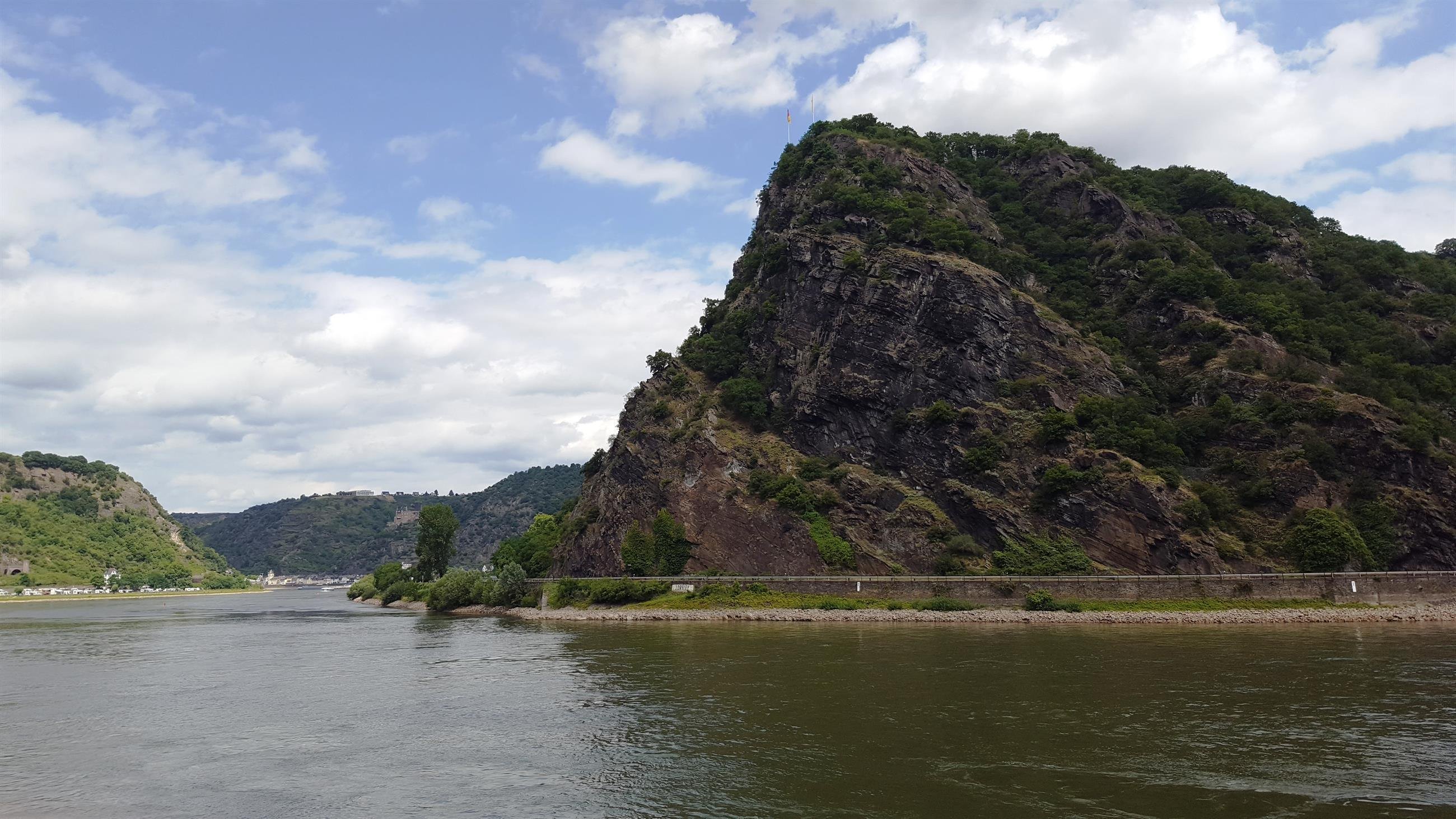 Der 125m hohe Schieferfels (193,14m über n.N) ist geologisch ca. 4 Millionen Jahre alt und seit dem 19. Jahrhundert Mittelpunkt der Rheinromantik. Der Rhein ist hier nur 175 m breit. Entsprechend stark ist hier die Strömung. Eine zusätzliche Gefahr stellten früher die Felsenriffe im Wasser dar, so dass die Schiffe hier großen Gefahren ausgesetzt waren. Viele Schiffe versanken und viele Menschen mußten ihr Leben lassen. Das Wort Loreley entstammt den Worten "Ley"=Felsen und "Loren"= Lauschen. Dies wurde vermutlich abgeleitet vom Rauschen der Stromschnellen und dem Summen des mehrfachen Echos im engen Talabschnitt.