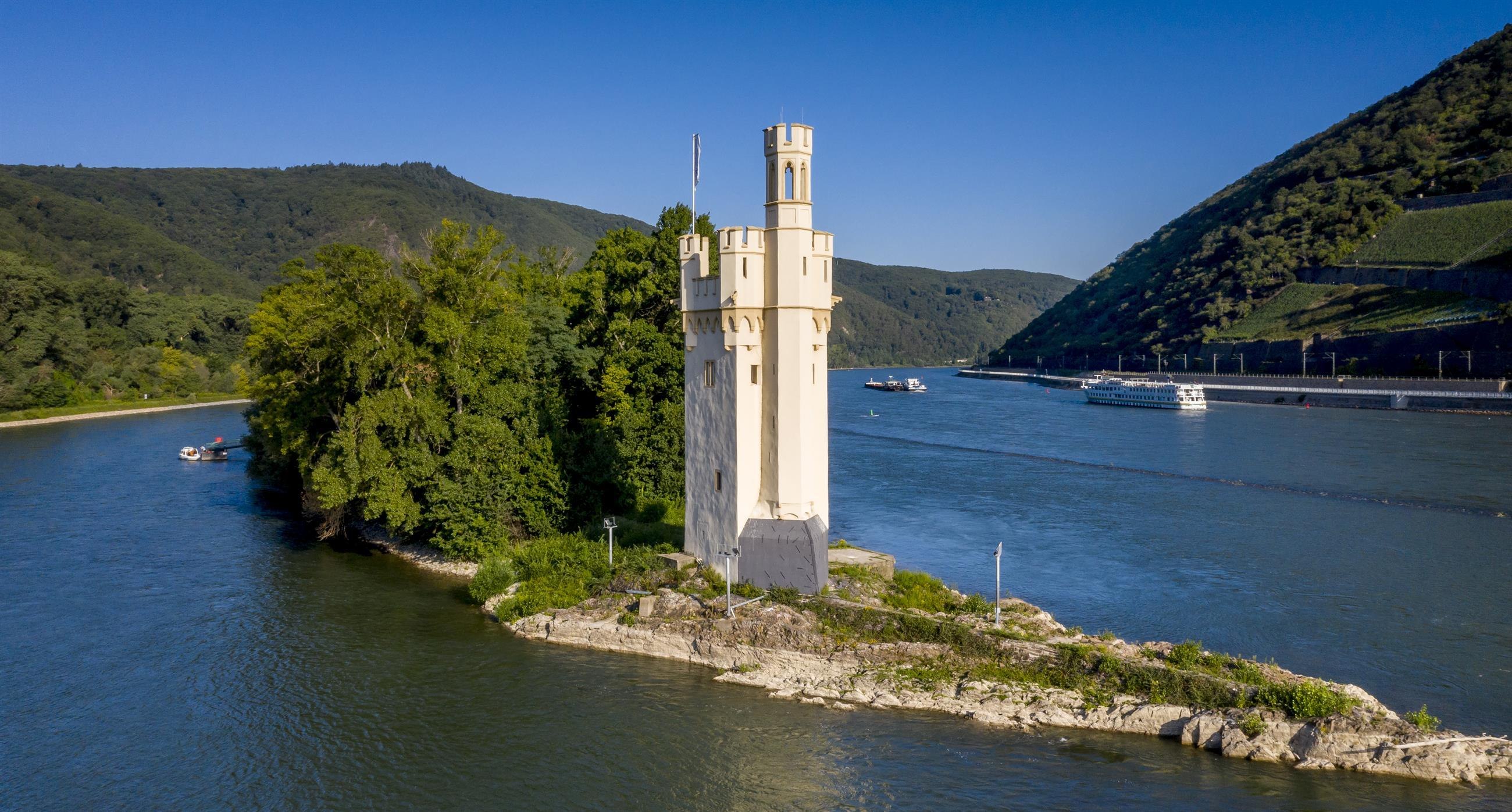 Historische Überlieferungen und Legenden ranken sich um den Turm auf der kleinen Rheininsel vor Bingen. Tatsache ist wohl, dass schon die Römer hier eine kleine Befestigungsanlage bauten. In der Herrschaftszeit der Franken verfiel diese aber mehr und mehr. Erst als Hatto II. 968 die Führung im Erzbistum Mainz übernimmt und Souverän über Bingen wird, gewinnt der Turm wieder an Bedeutung. Der Name „Mäuseturm", der 1516 erstmals belegt ist, leitet sich wohl von seiner Funktion als Wachturm (mittelhochdeutsch „musen" = lauern) ab. Doch der Turm wurde schon im 16. Jahrhundert mit der Legende von Bischof Hatto in Verbindung gebracht, der hier als Strafe für seine Unbarmherzigkeit bei lebendigem Leibe von Mäusen aufgefressen worden sei. Im Jahr 1298 wird der Turm in das Zoll- Sperrsystem der Burg Ehrenfels einbezogen.1689 zerstören französische Truppen das Bauwerk. 1855 errichten die Preußen auf der Insel einen Signalturm für die Schifffahrt, wie er heute noch zu sehen ist.