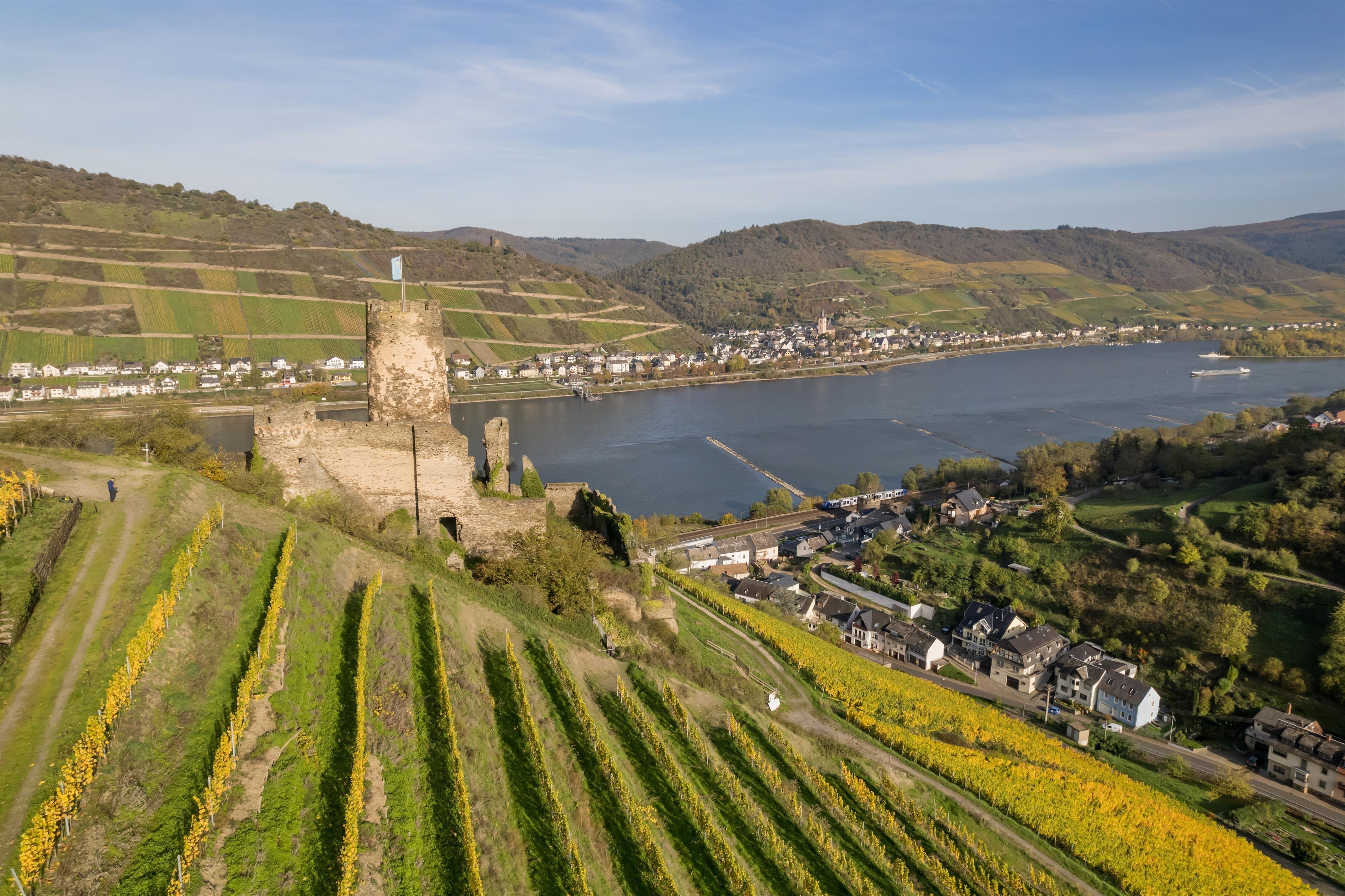 Die Ruine Fürstenberg liegt oberhalb des Ortes Rheindiebach inmitten malerischer Weinberge.