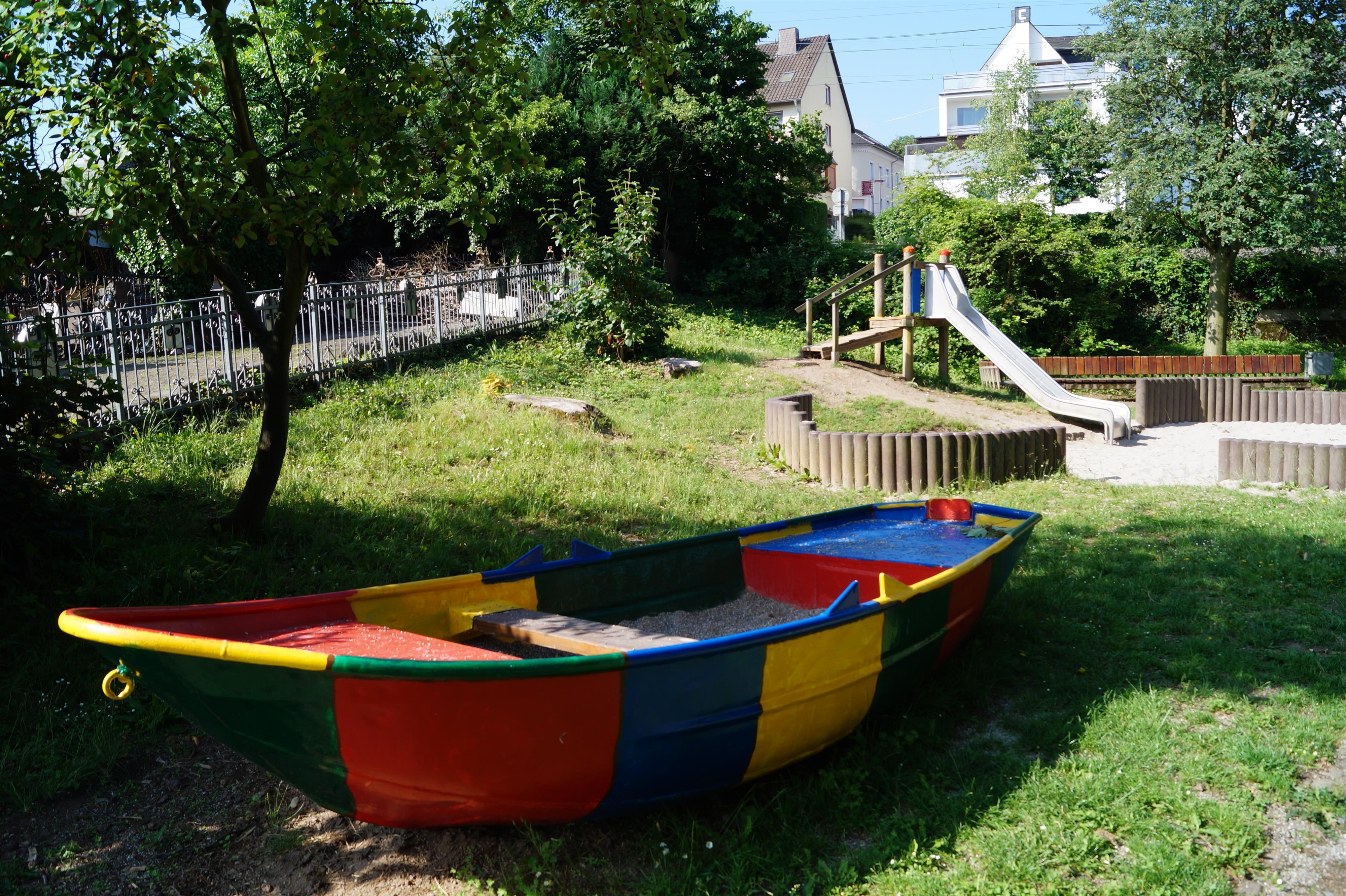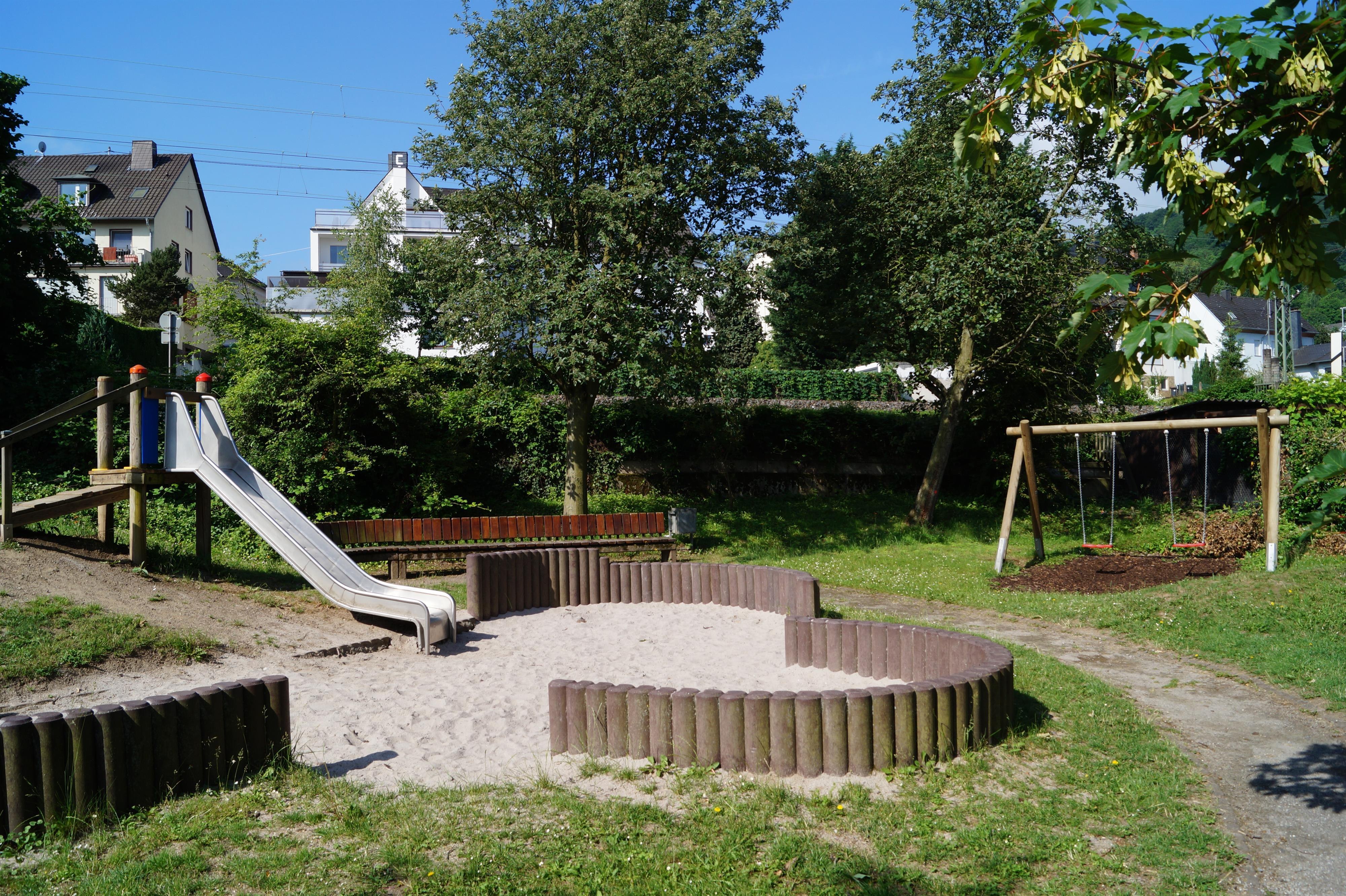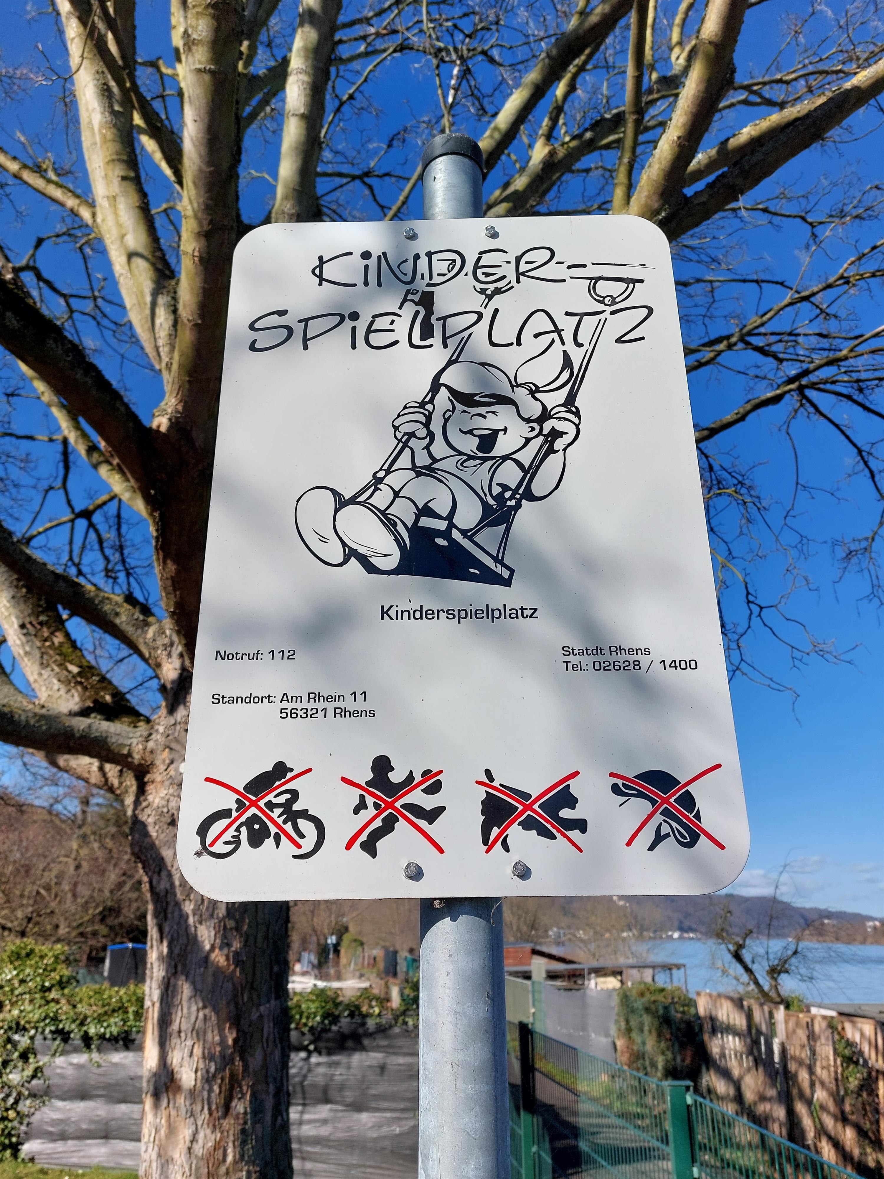 Der öffentliche Spielplatz liegt direkt am Rhein und bietet vielfältige Spiel- und Bewegungsmöglichkeiten für Kinder. Zur Ausstattung gehören eine Rutsche, ein Sandkasten, eine Schaukel sowie ein Spielturm beziehungsweise Spielhaus mit Kletterseilen und einer Rutschstange. Sitzgelegenheiten zum Ausruhen sind ebenfalls vorhanden.