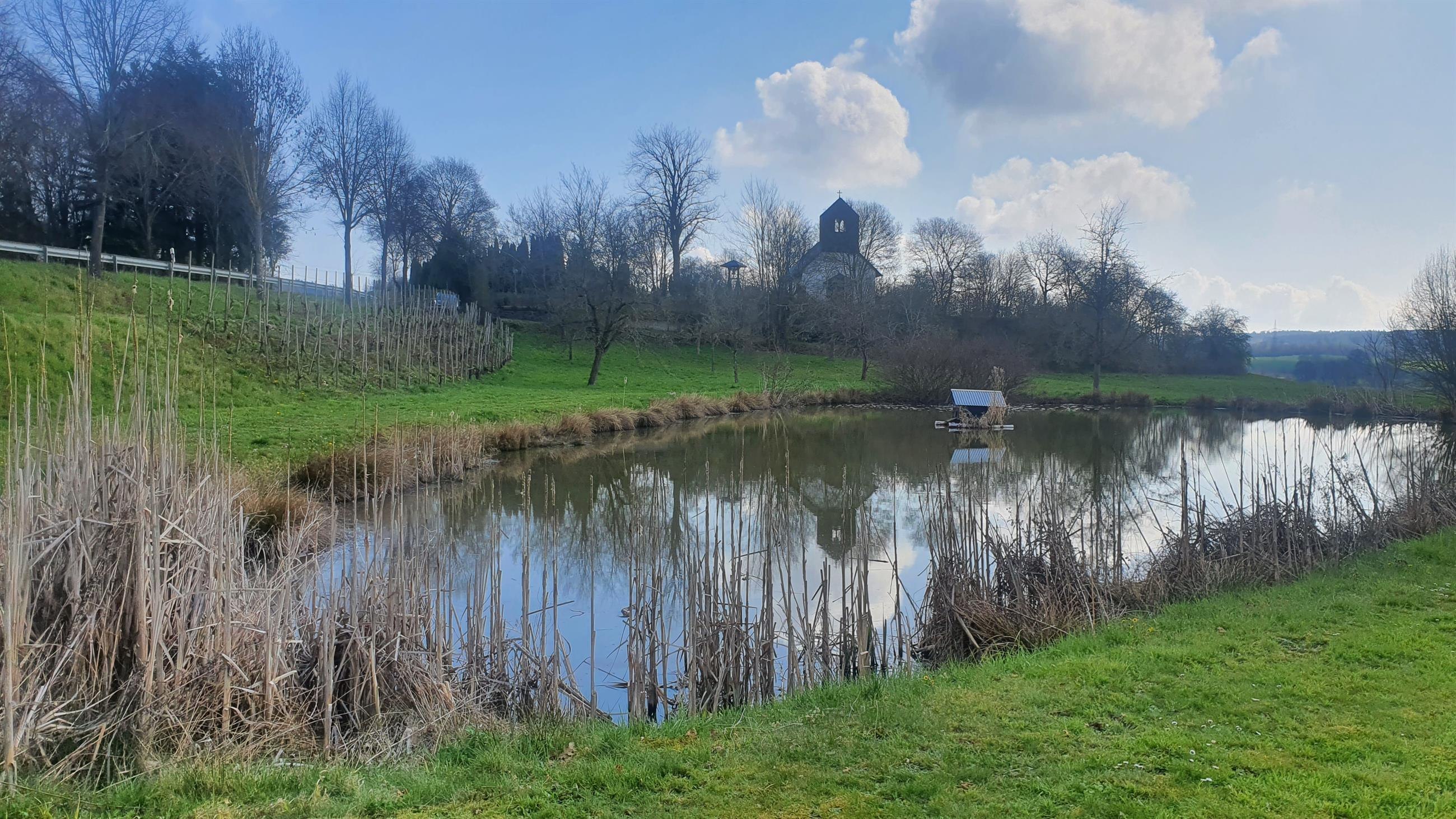 In unmittelbarer Nähe der Naturschleife "Oberes Simmerbachtal" befindet sich ein kleiner, idyllisch gelegener Teich mit einer Ruhebank zum Verweilen.