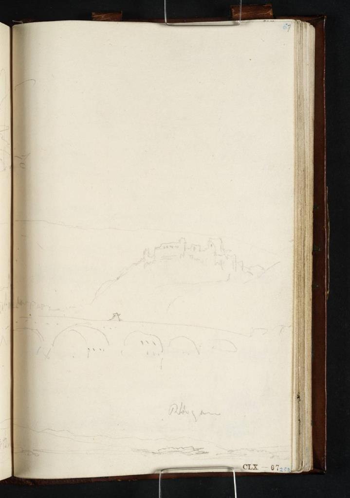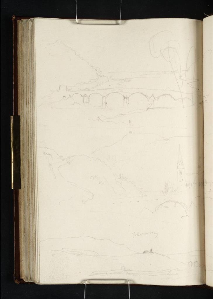 Bevor Turner am Abend des 25. August 1817 zu den Anlegestellen am Rhein gelangt, um seine Reise mit dem Schiff fortzusetzten, legt er an der Naheüberquerung noch einen Skizzenstopp ein. Das vollendete Aquarell zeigt Teile der Stadt Bingen, die darüber wachende Burg Klopp und Burg Ehrenfels in der Distanz. Im Vordergrund ist die Drususbrücke dargestellt, hinter der unweit die Nahe in den Rhein mündet. Turner erreicht in diesem Bild einen gelungenen Kontrasteffekt von Licht und Schatten mit den sich ballenden Gewitterwolken, was dem Bild einen dramatischen Akzent verleiht. Das Bild weist eine gewisse kompositorische Nähe zu Turners Koblenzern Bildern mit Moselbrücke auf. Der Standort selbst ist heute unzugänglich. Der Blick Richtung Rheingau lässt sich von der Drususbrücke erfahren.