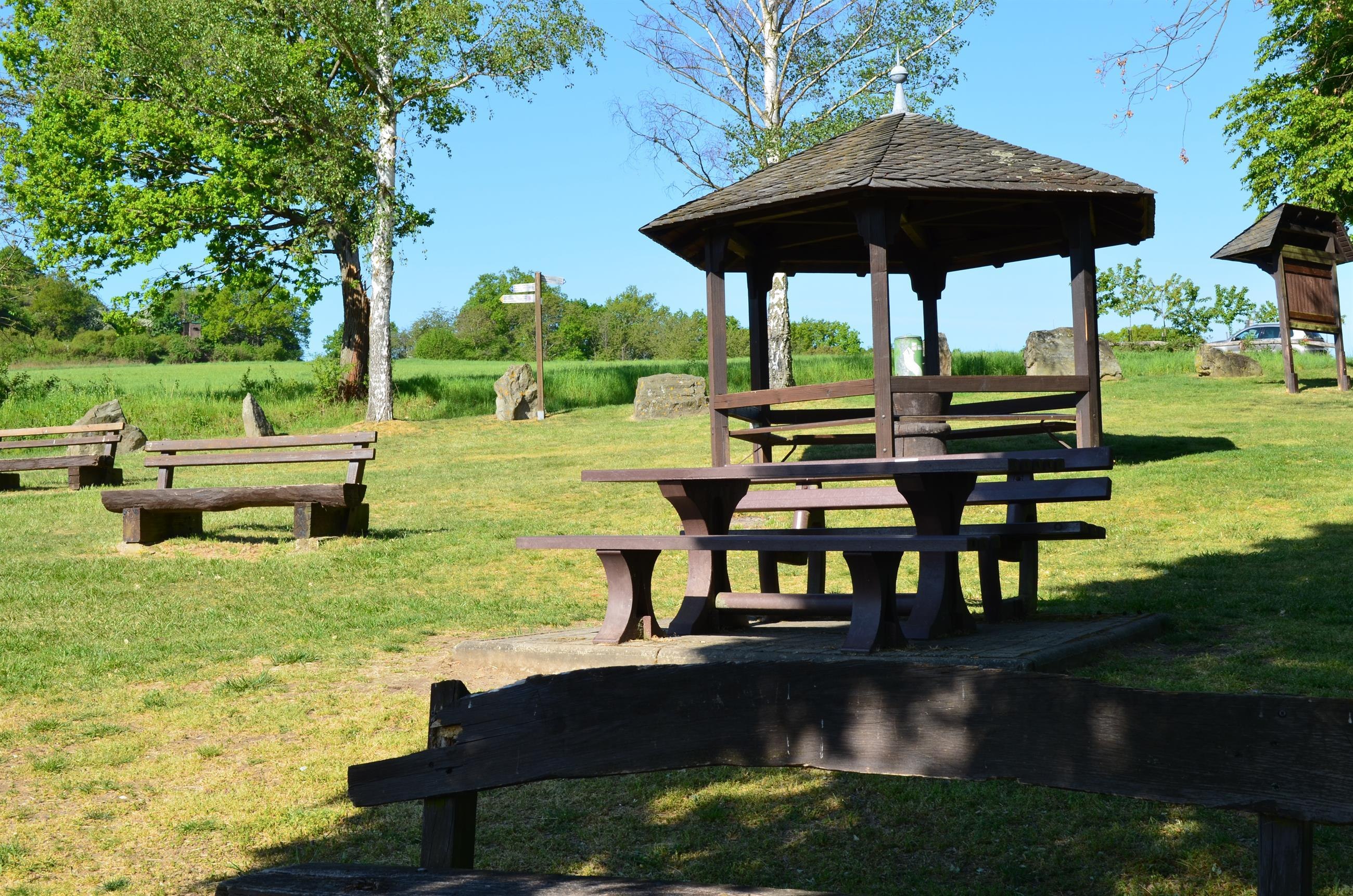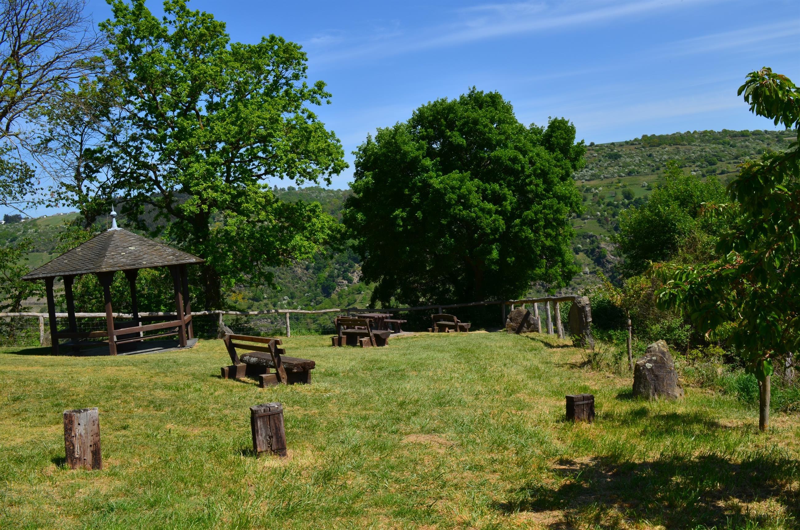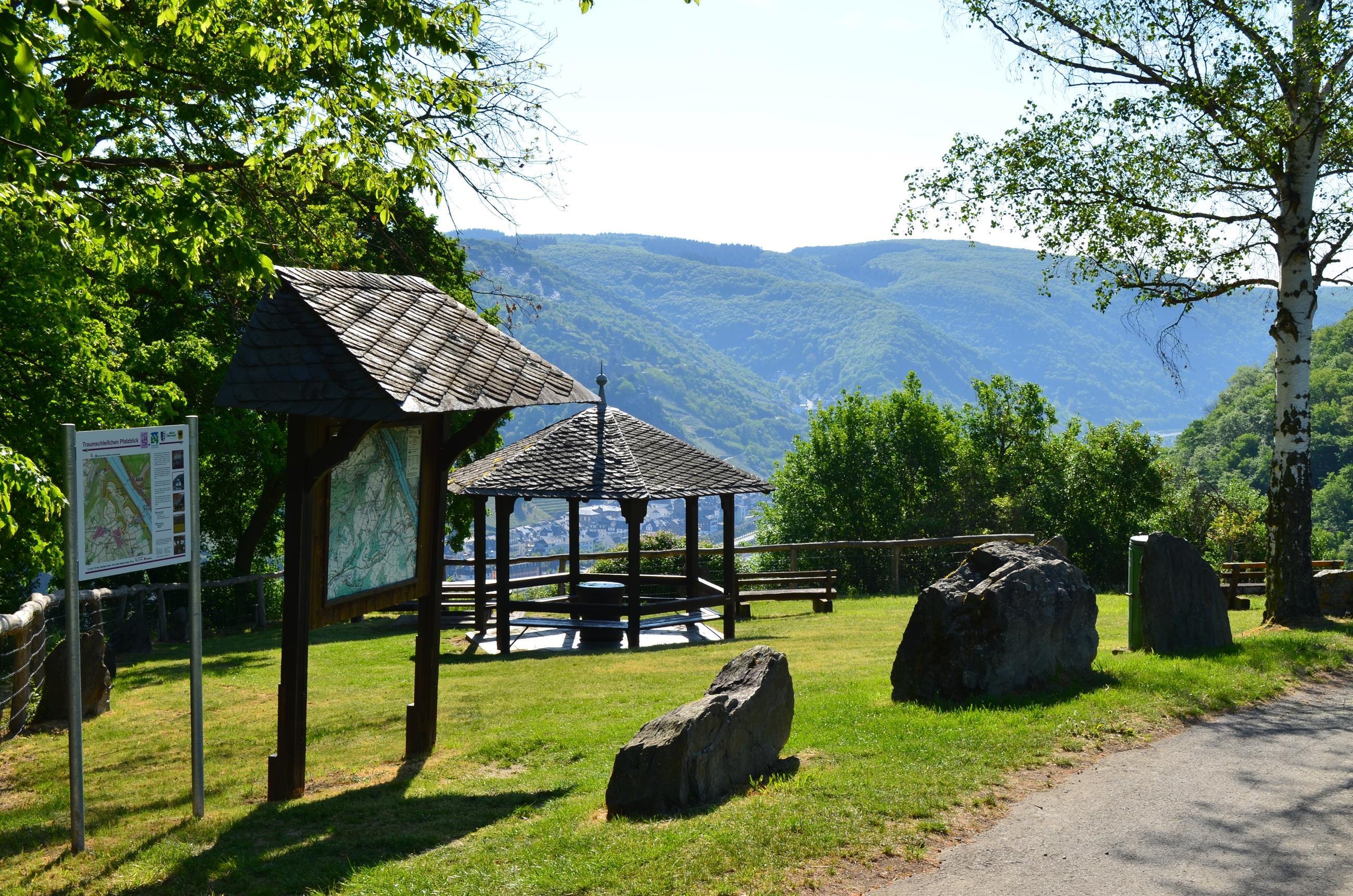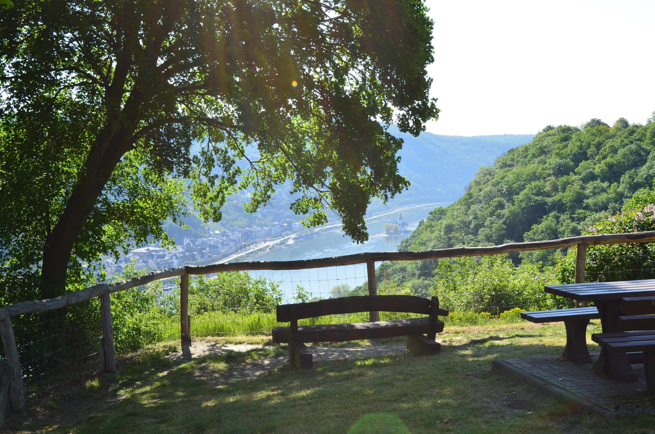 Wonderful rest area with some seating, tables and covered pavilion. Magnificent view of the Rhine, Gutenfels Castle with Kaub and Pfalzgrafenstein Castle in the Rhine. Large parking lot from the K 89 about 50 m away. Located directly on the RheinBurgenWeg. Also a starting point of the dream loop "Pfalzblick".