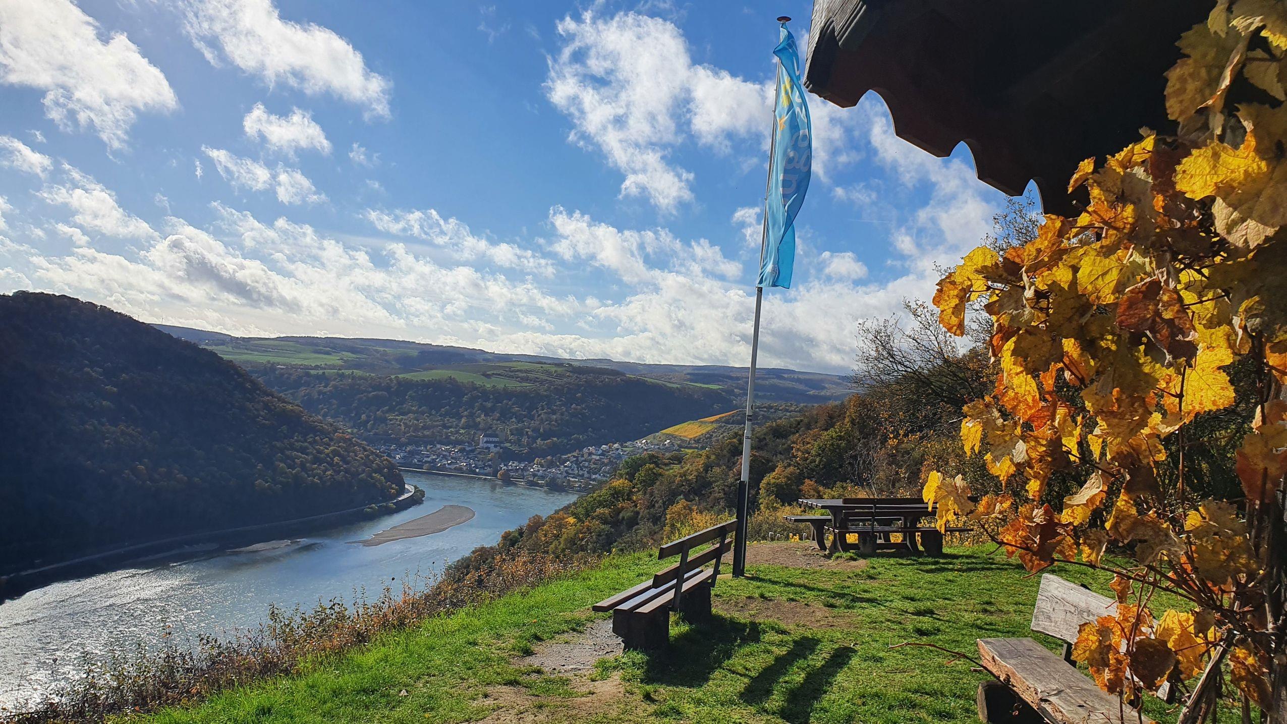 Shelter on the Büttenplatz in Urbar with a view of the town of Oberwesel and the vineyards on the Oelsberg as far as the Hunsrück heights.