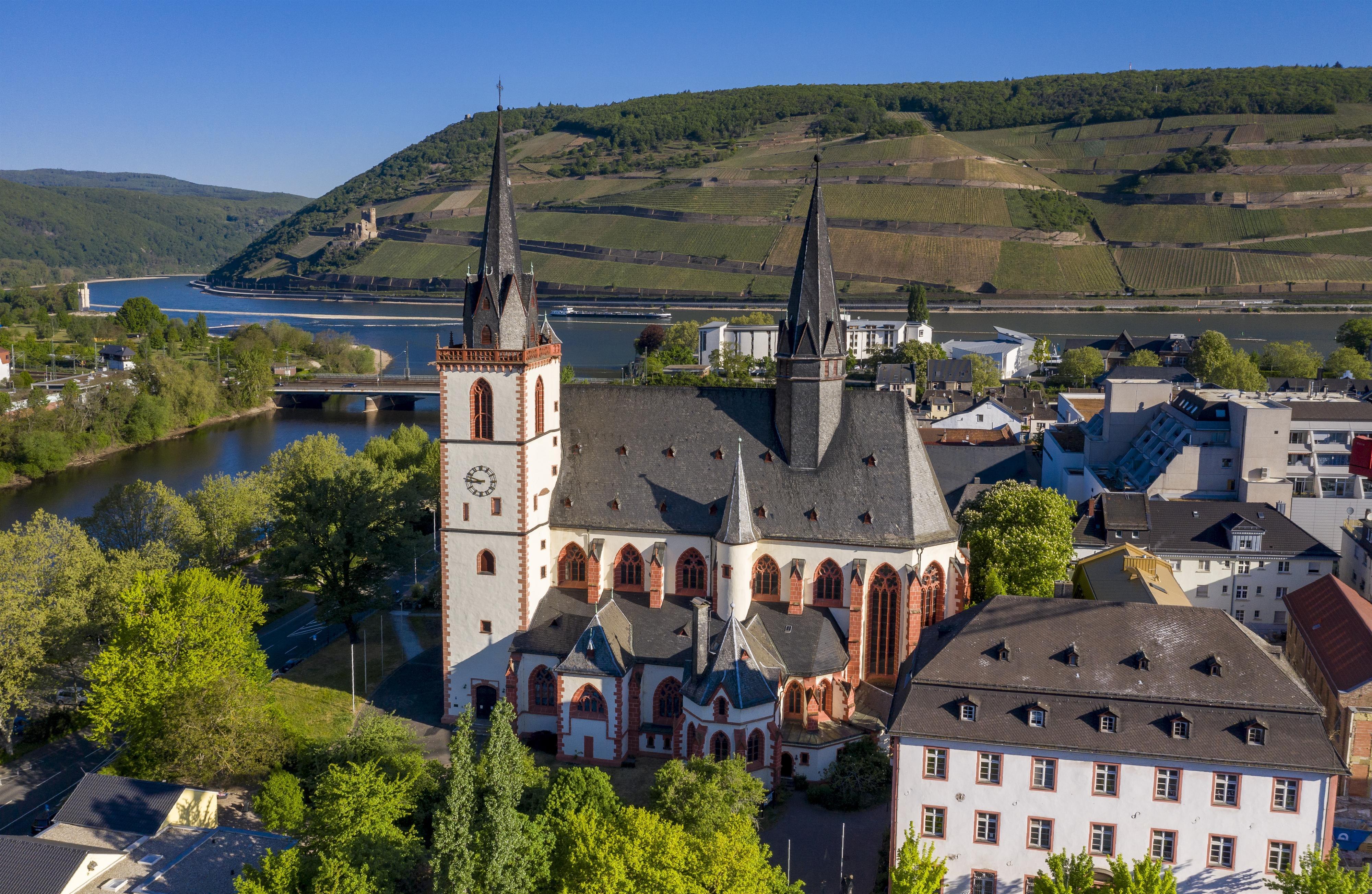 Evidence of the remains of a Roman temple to the god Mercury which was destroyed in 406 AD has been found underneath the building. Today’s late Gothic church still contains the crypt of the original building dating from the first half of the 11th century. This is one of the earliest examples of ecclesiastical architecture on the Middle Rhine. The rich furnishings include the shrine of St. Hildegard and the reliquary shrine of St. Rupert of Bingen as well as several superb Middle Rhine statues from the 14th and 15th centuries.