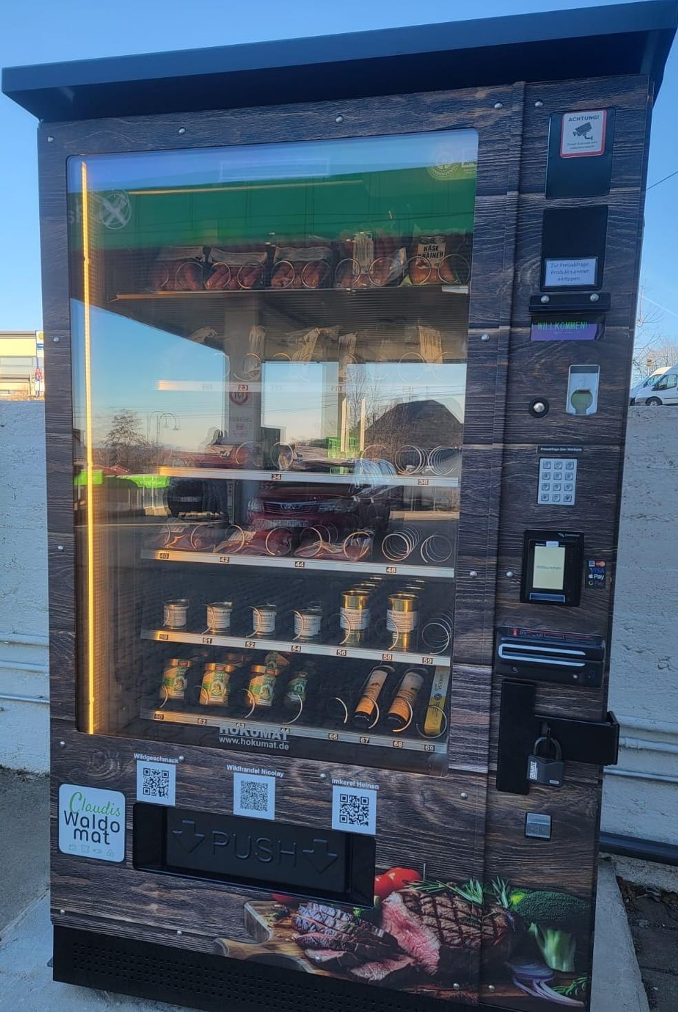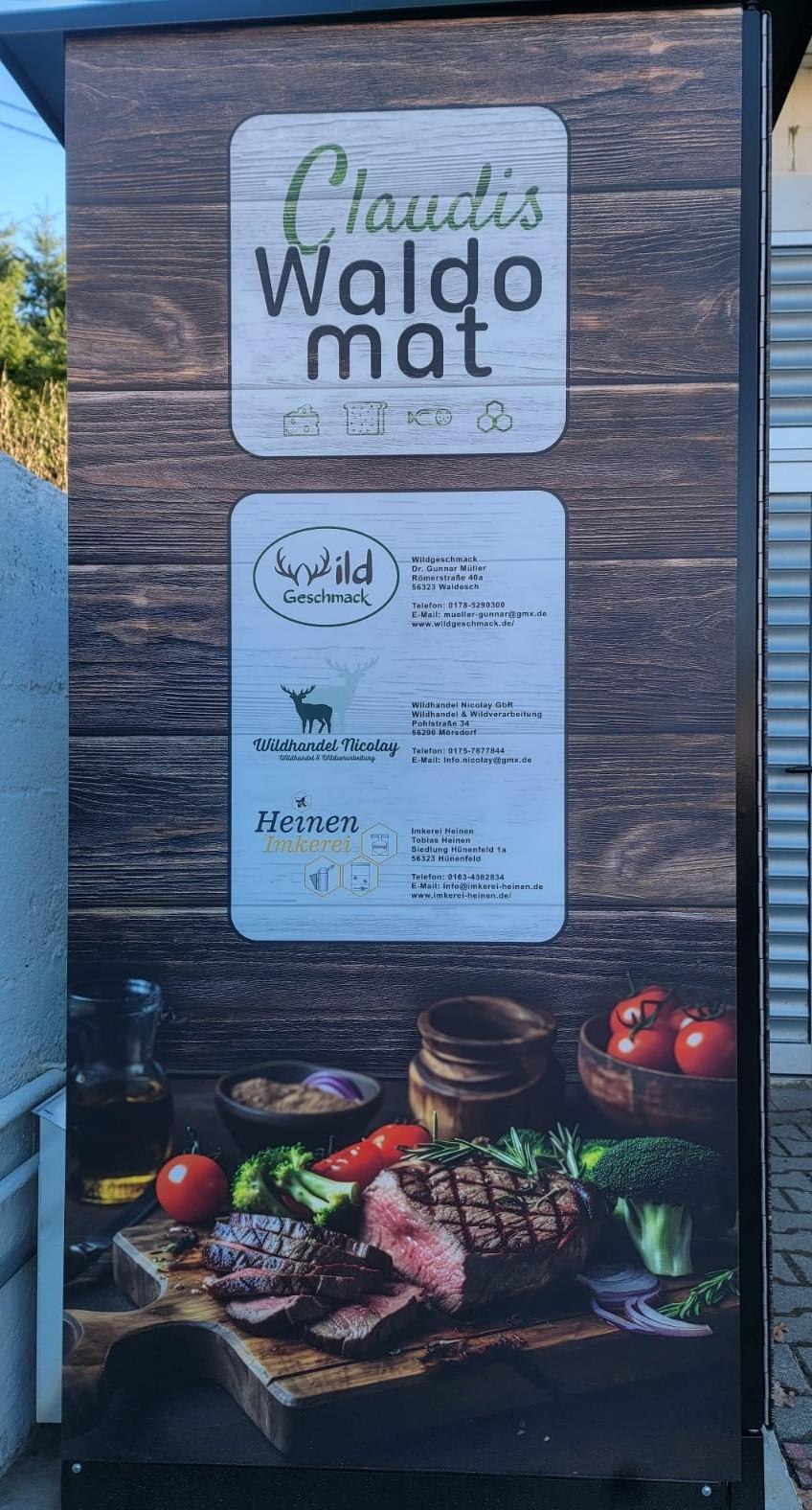 Claudis Waldomat is a vending machine in Waldesch that offers fresh, regional game meat around the clock, high-quality beef, and various honey products. We, the Müller family, aim to make these high-quality food items accessible and inspire environmentally and animal welfare-conscious individuals. The product range includes seasonal items from deer, red deer, and wild boar, including sausages, pepperoni, ham, salami, steaks, and other specialties. Payment is only accepted cashless.
