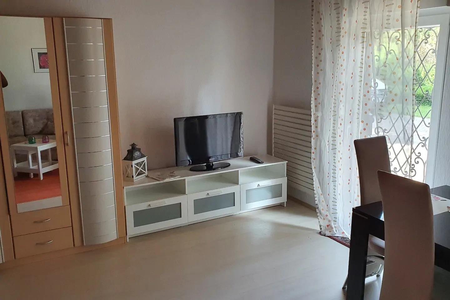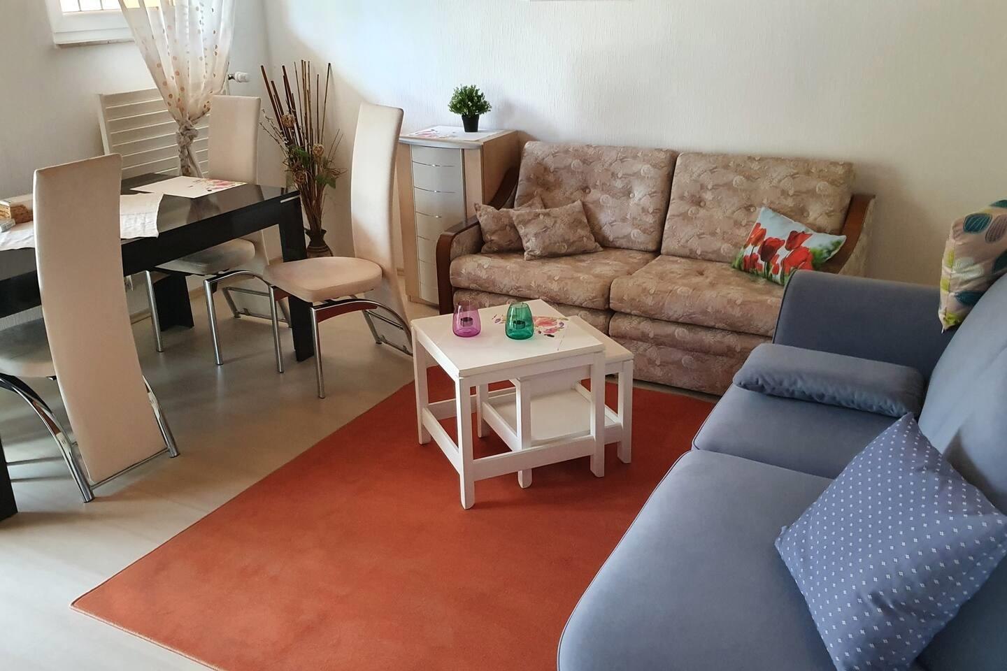 Lovingly furnished, you will feel comfortable with us. In the two-family house there are 2 young families with children. The garden is unique. With over 700 square meters of meadow land, trampoline and much more. even the youngest have fun. The apartment can be rented for up to 4 people, whereby the living room couch can easily be converted into a bed (1.50m wide, 1.40m long). The young families are happy about every guest, barbecues, nice conversations can be offered. Parking spaces are in front of the house. Bicycle parking space possible in a double garage.