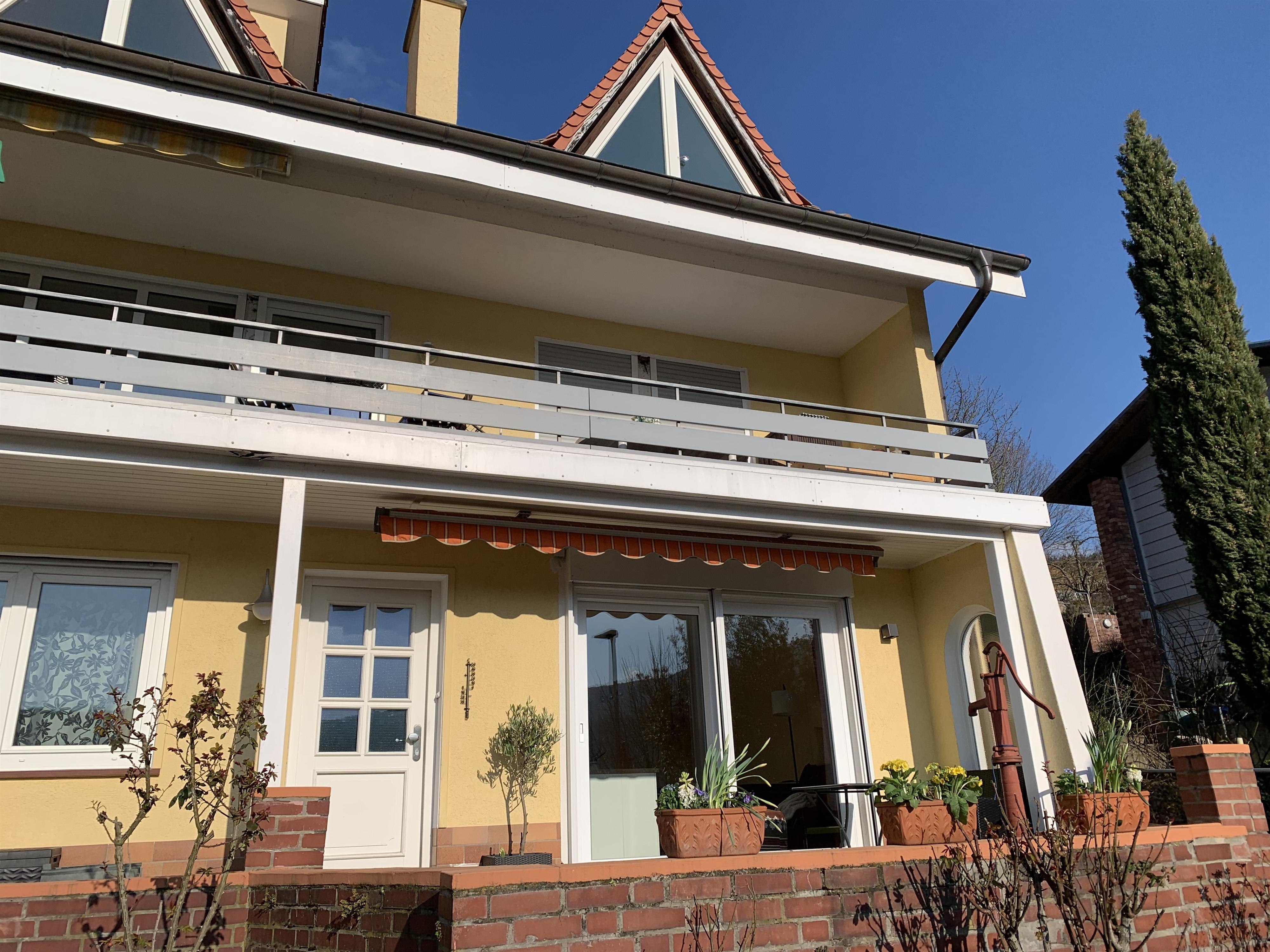 Our holiday apartment (approx. 62 sqm) is located in Lorch, on Binger Weg, not far from the train station, near Bächergrund, a beautiful valley with access to many hiking trails. Wineries and cozy wine taverns are within walking distance. The apartment consists of an open living kitchen, a large bedroom, two shower bathrooms, and a small office. It has its own entrance, which can be accessed via a beautiful, large terrace.