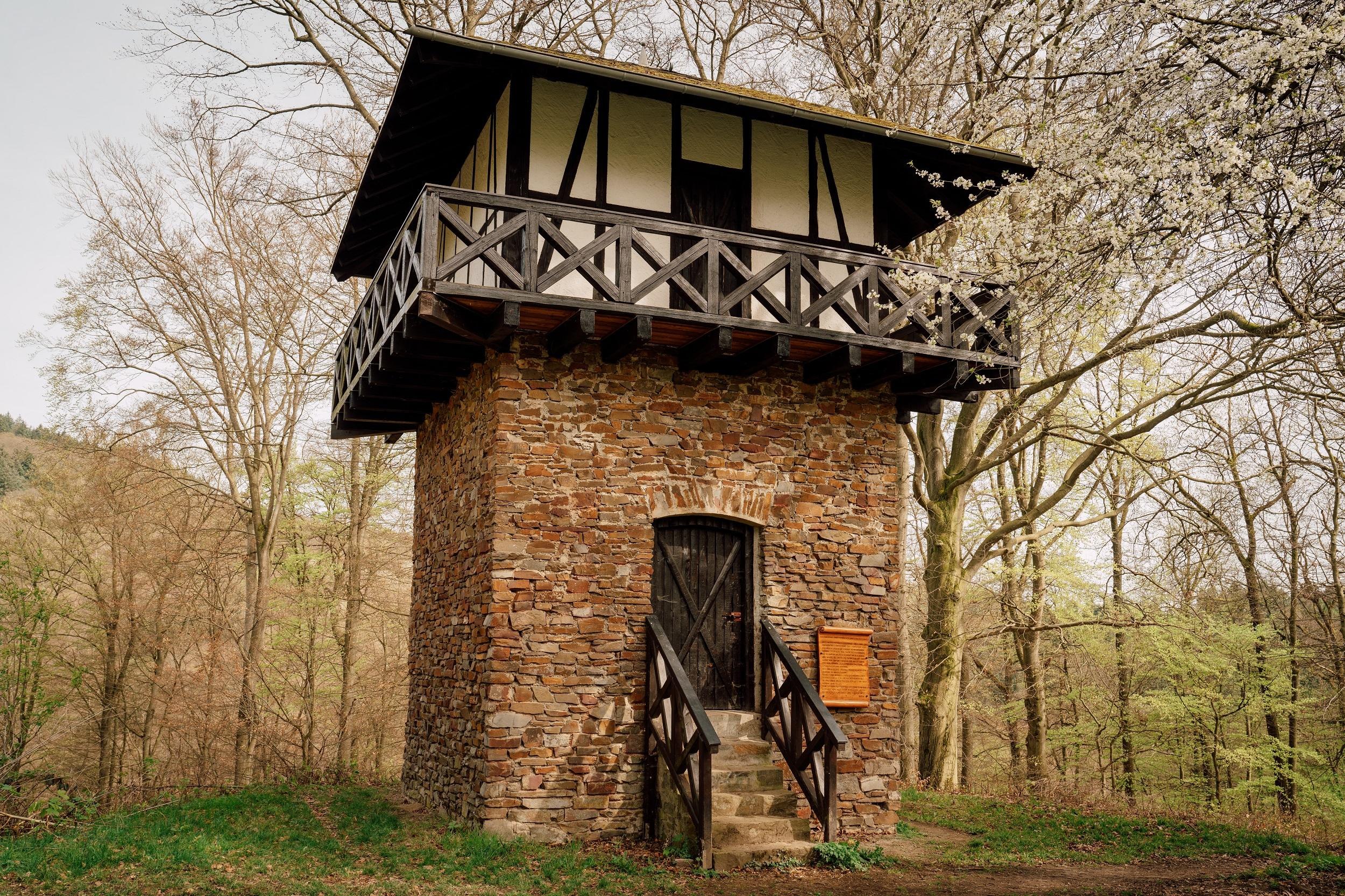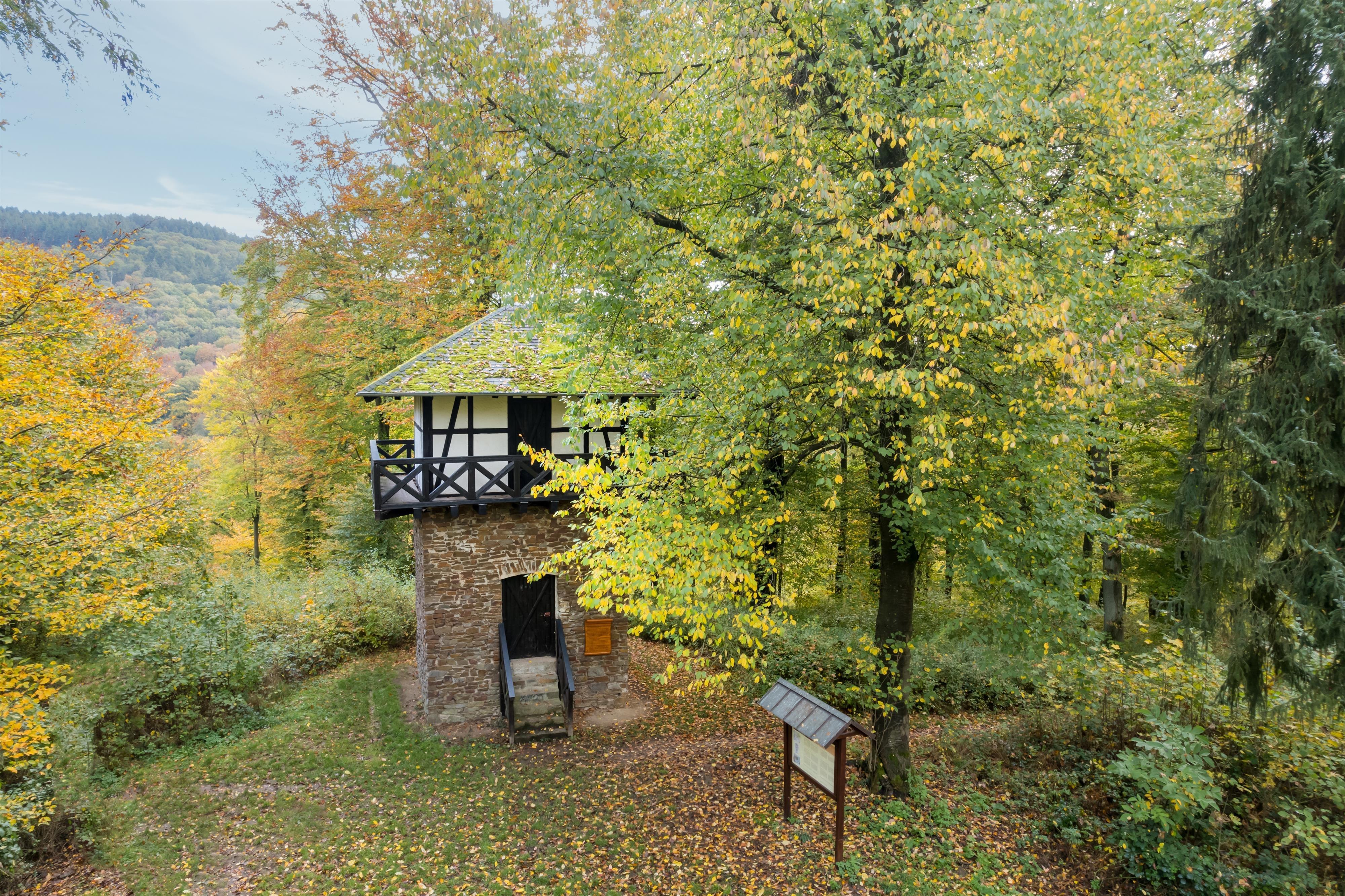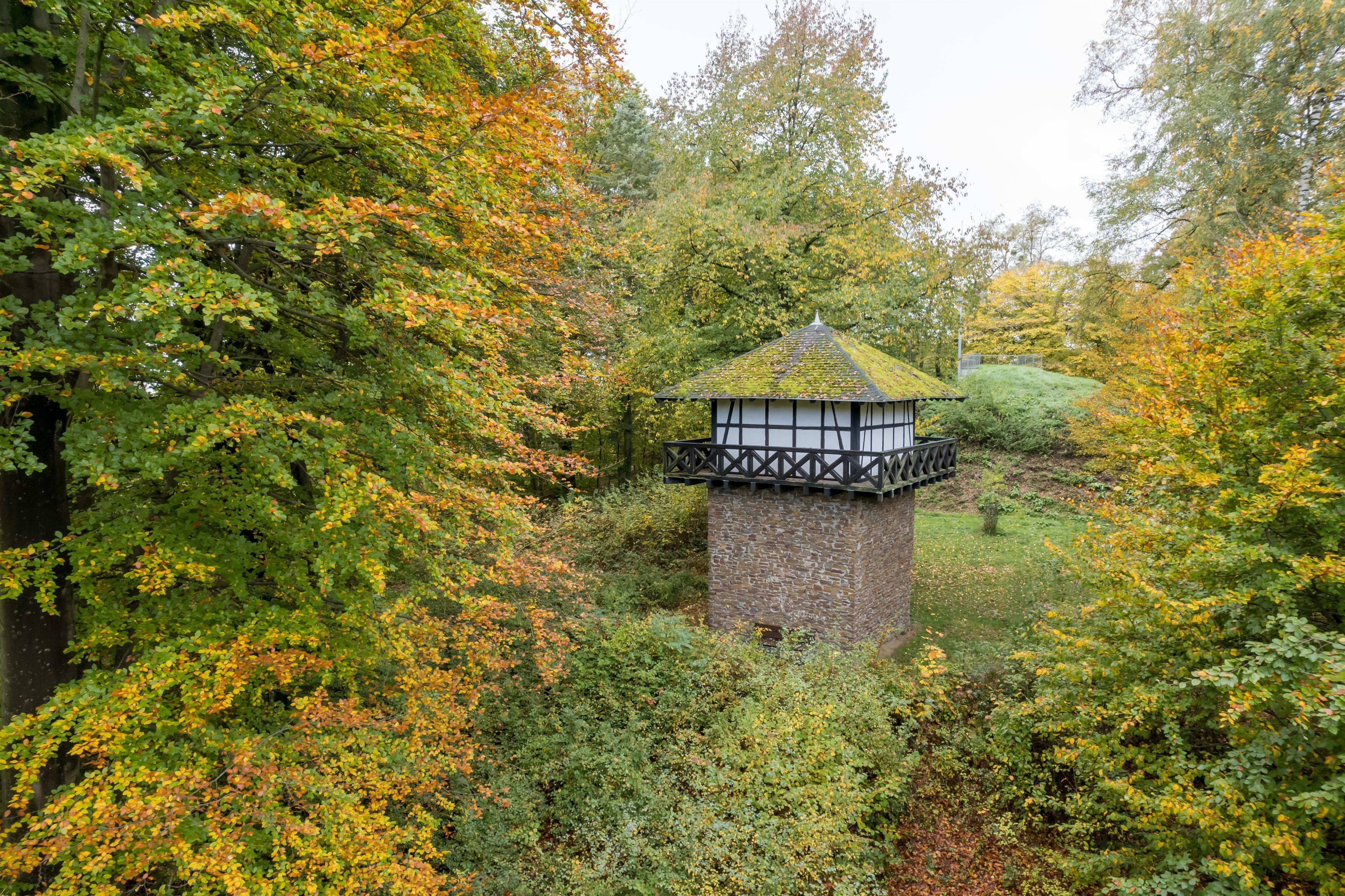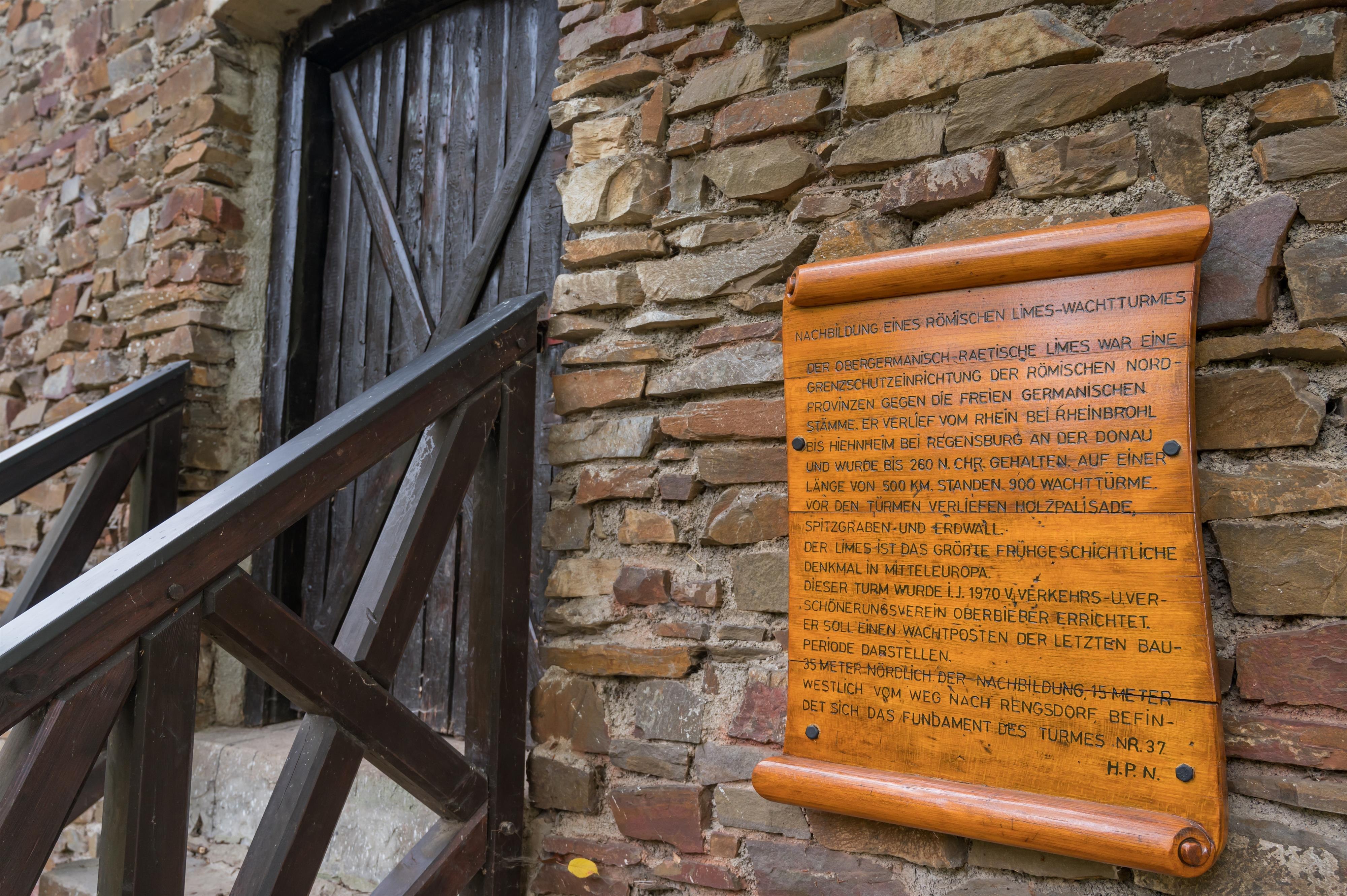 From Niederbieber, the Roman-Germanic Limes once ran further over the ridge of the Wingertsberg into the Aubachtal valley and then up the Alteck, continuing through the Gladbach-Heimbach-Weiser forest down to Sayn, where it exited the present-day Neuwied city area. In the Neuwied city area, there were about 35 Limes towers, one of which was located on the summit of the Wingertsberg. Not far from its foundations, which are preserved in the ground and currently built over, a model of this tower was erected in 1969/71 as a historical monument.