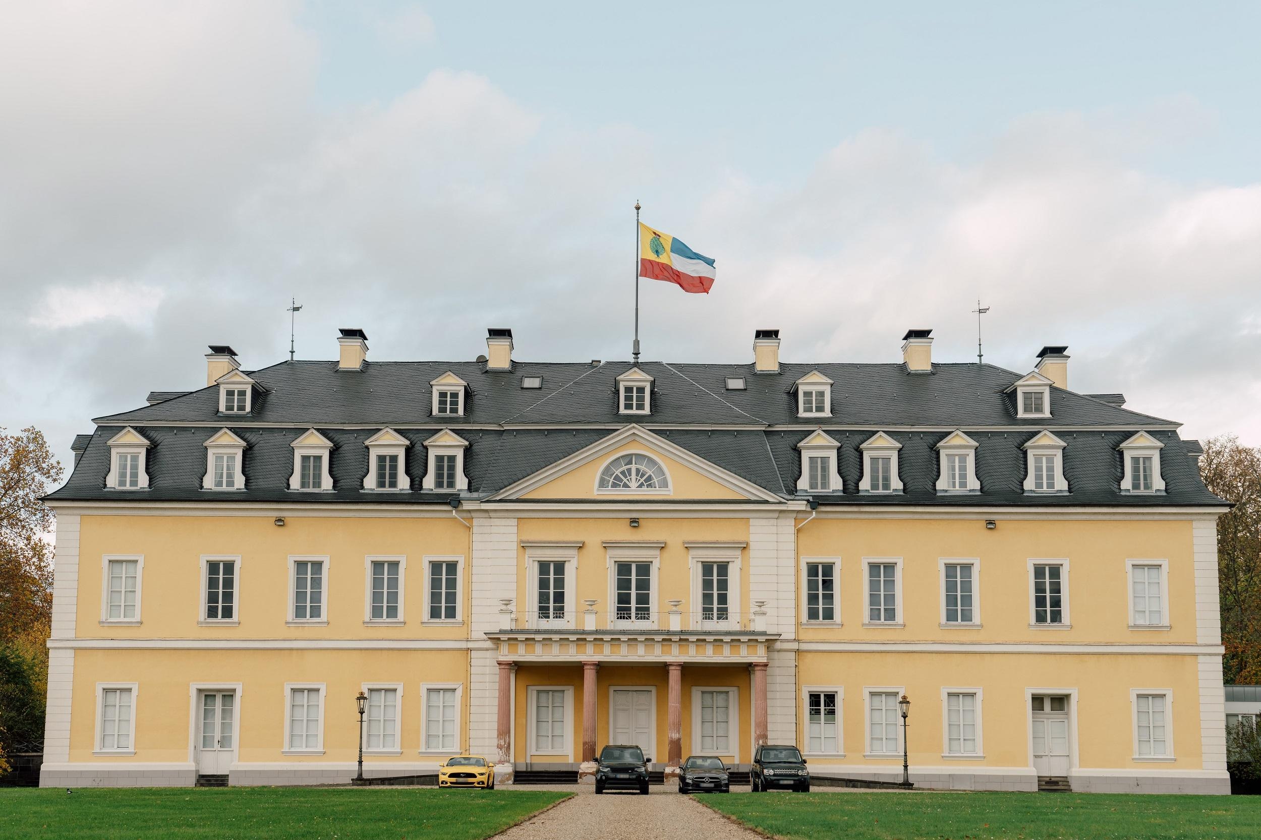 That the Rhine represents an important transportation route and main economic axis, thus serving as a lucrative source of income, became clear to Count Friedrich III. of Wied in the mid-17th century. In 1653, he received permission from the Emperor to establish a new town, Newen Wiedt, on the site of the war-damaged village of Langendorf. In 1648, he had purchased a property close to Langendorf from the Metternich family, which he developed in a bastion-like structure and already called Newen Wiedt. This residence was destroyed by French troops in 1694. It was not until his son, Count Friedrich Wilhelm, commissioned the construction of a new castle from 1707 to 1711 based on 1706 plans, modeled after Versailles in a horseshoe shape. The designs preserved in the castle archive were only partially realized. The connection of the two side wings to the main building, the Corps de logis, was omitted due to lack of funds. These side wings, built in stages, were not completed until 1756. The Italian stucco craftsmen Gemone and Castelli created the festive interior decorations.