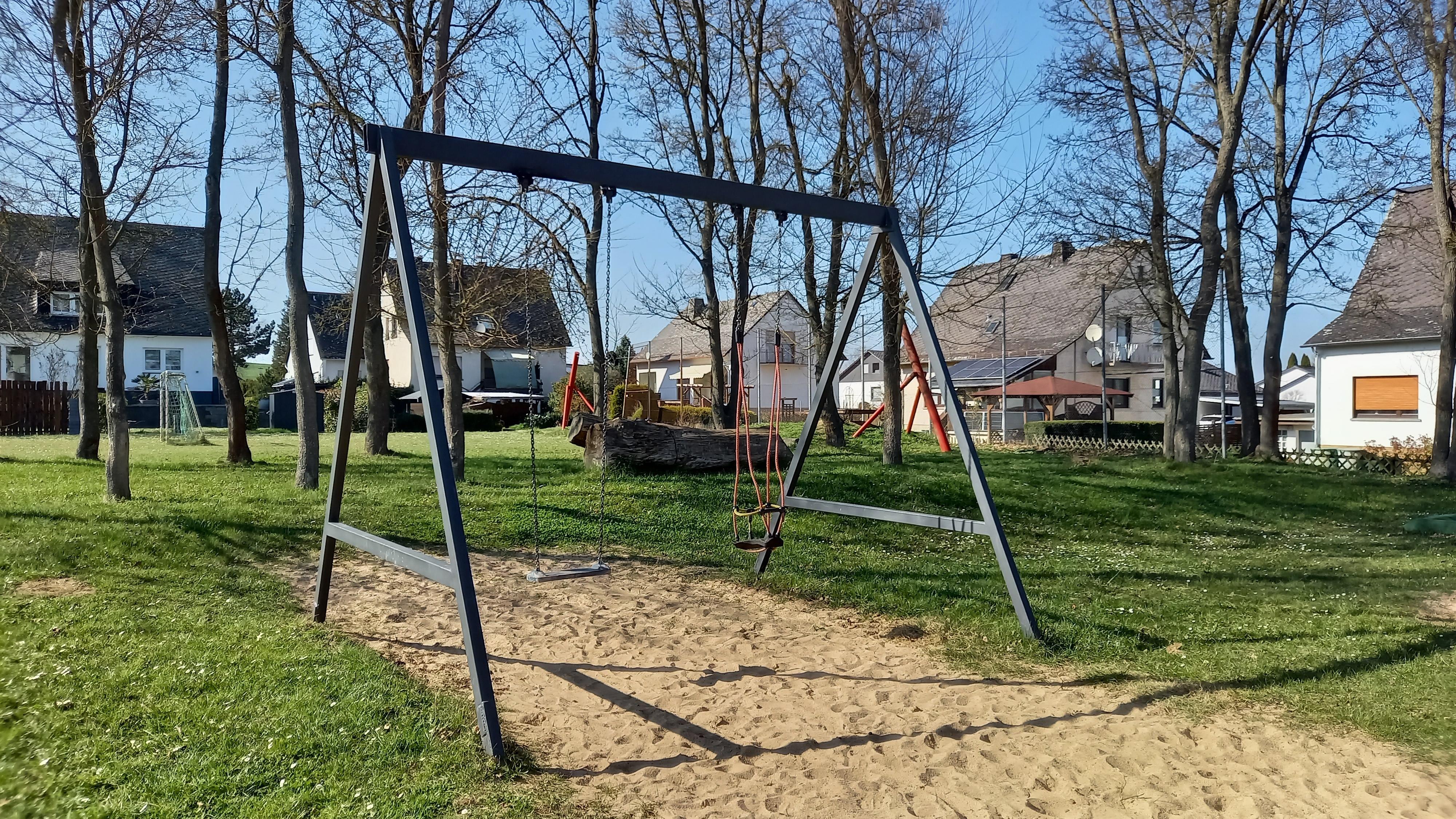 Beautiful playground in the center of Urbar with many play equipment, sandbox, and a climbing tower with slide.