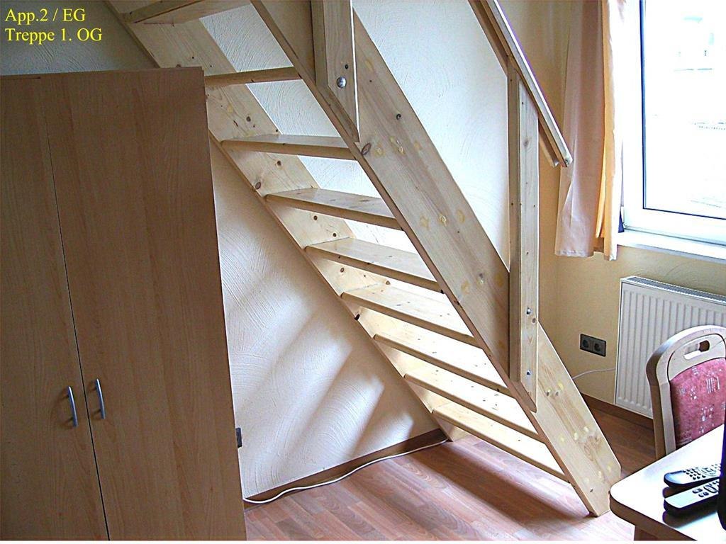 Una escalera conduce al piso superior, donde están las 2 camas (90x200), que pueden estar tanto separadas como juntas. También hay "percheros" para la ropa.