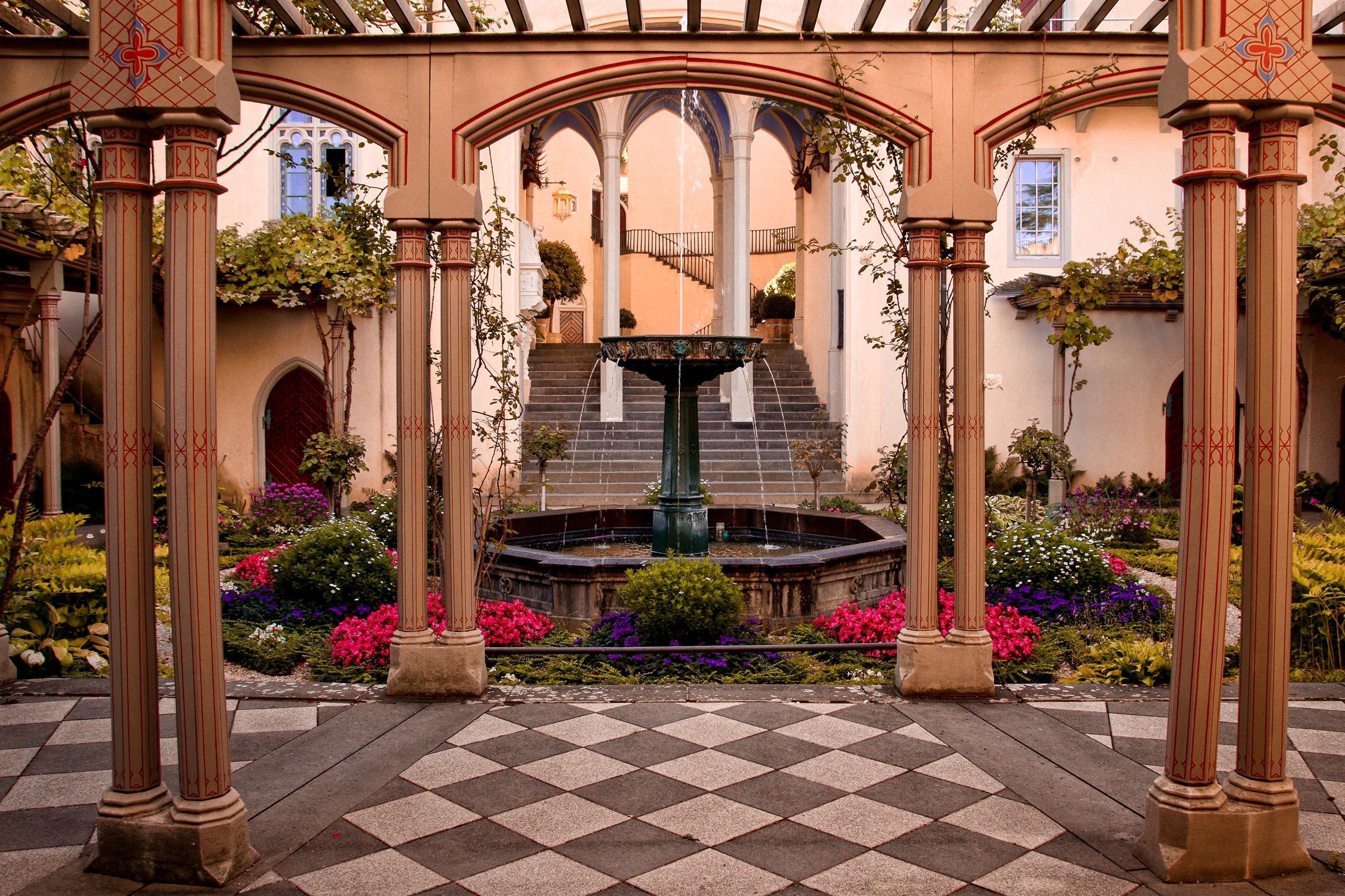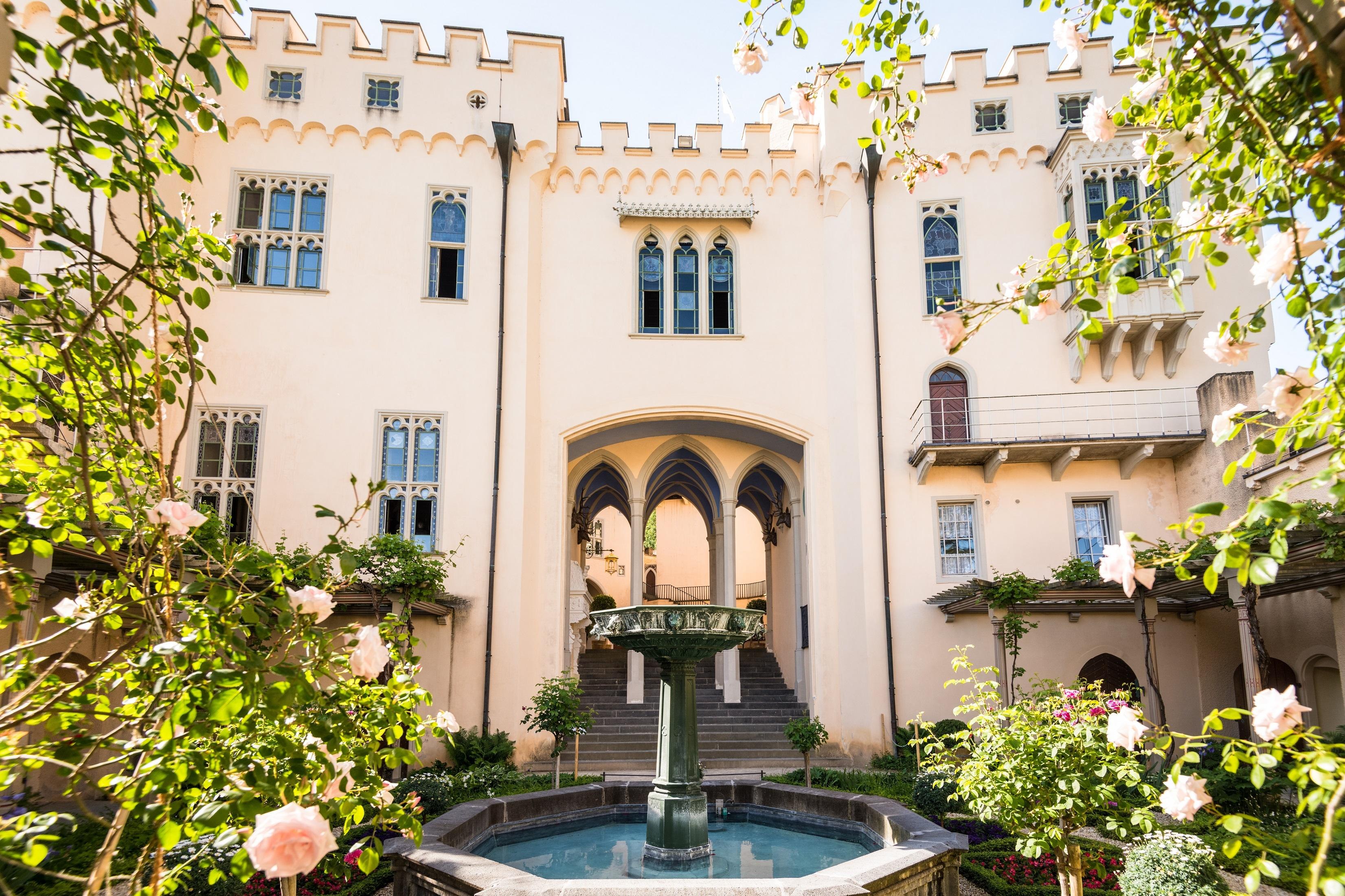 Los visitantes pasean hacia el castillo por los jardines diseñados por el director de jardines prusiano Peter Joseph Lenné.