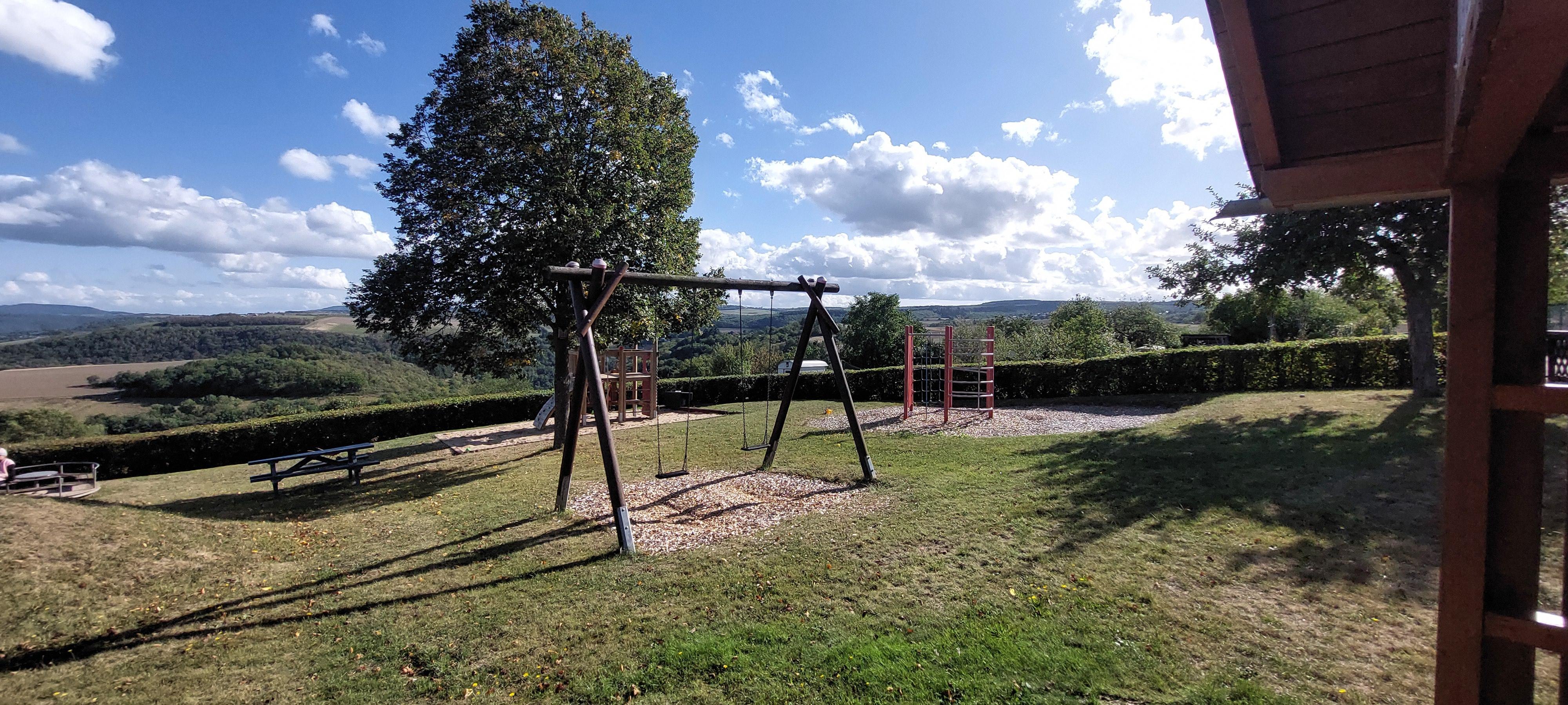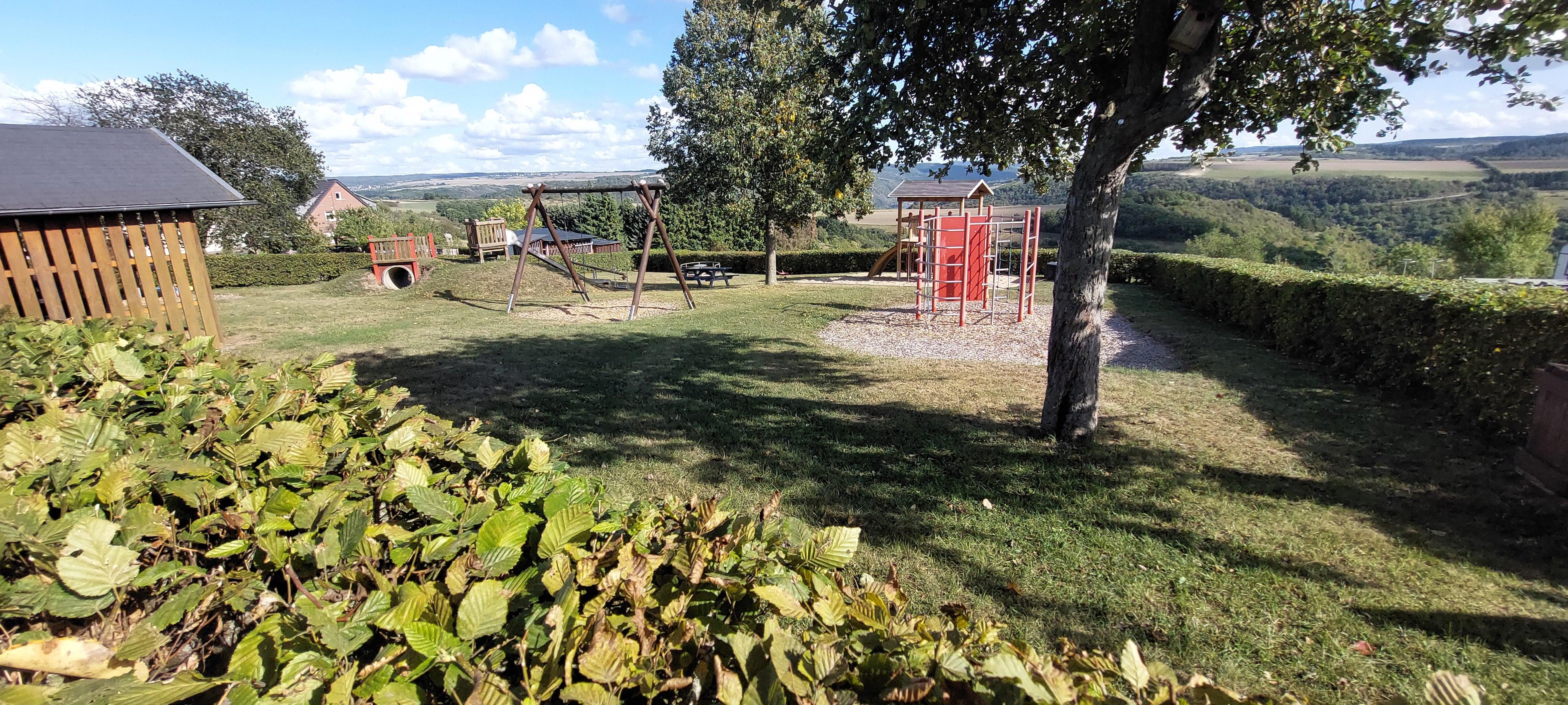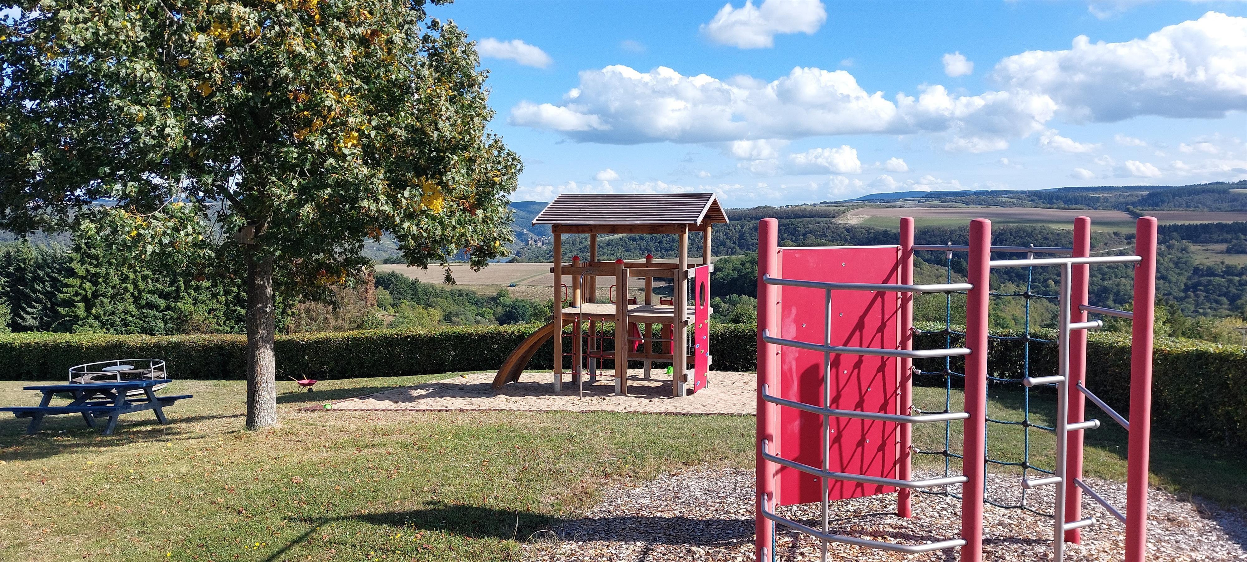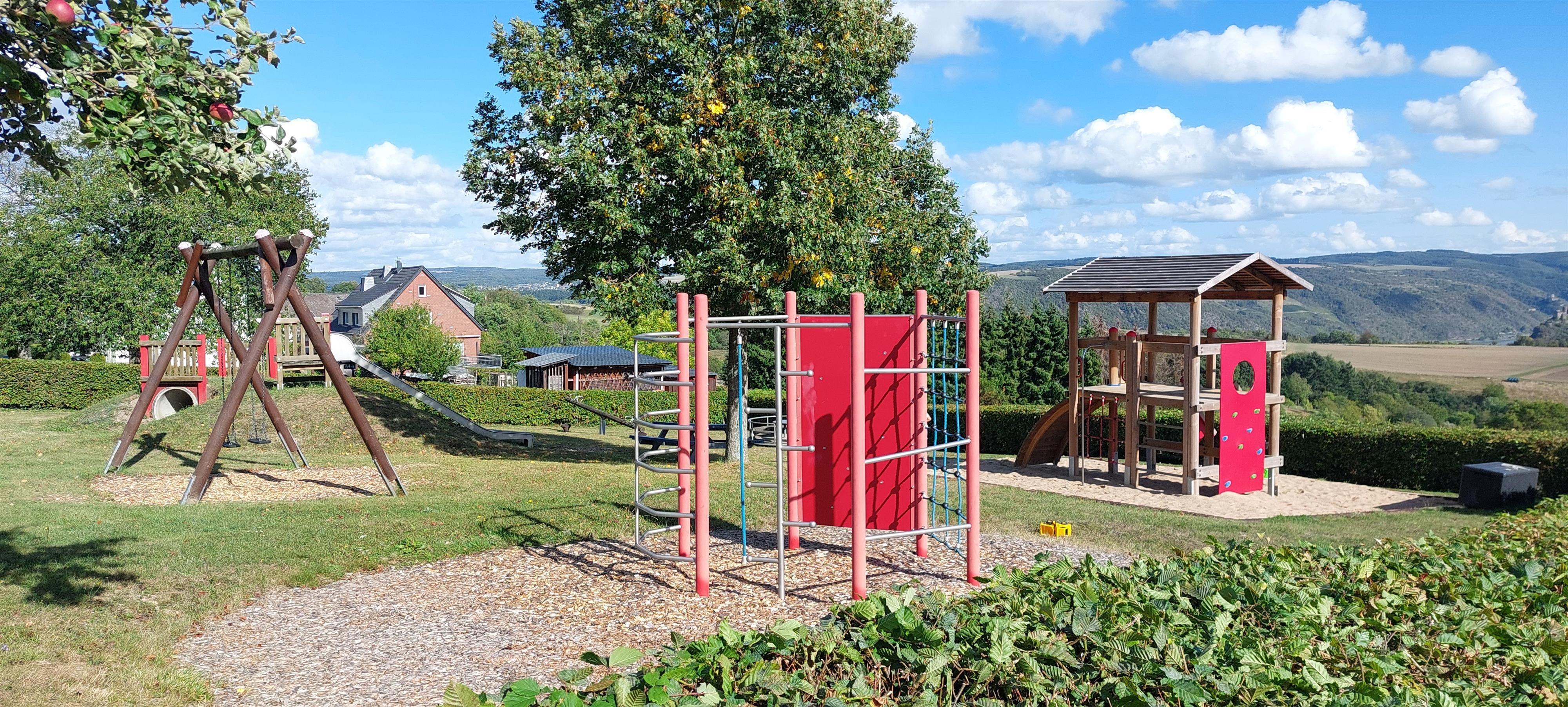 Parque infantil bonito y bien cuidado en las afueras de Niederburg con una hermosa vista al valle del Rin y muchas posibilidades de juego.