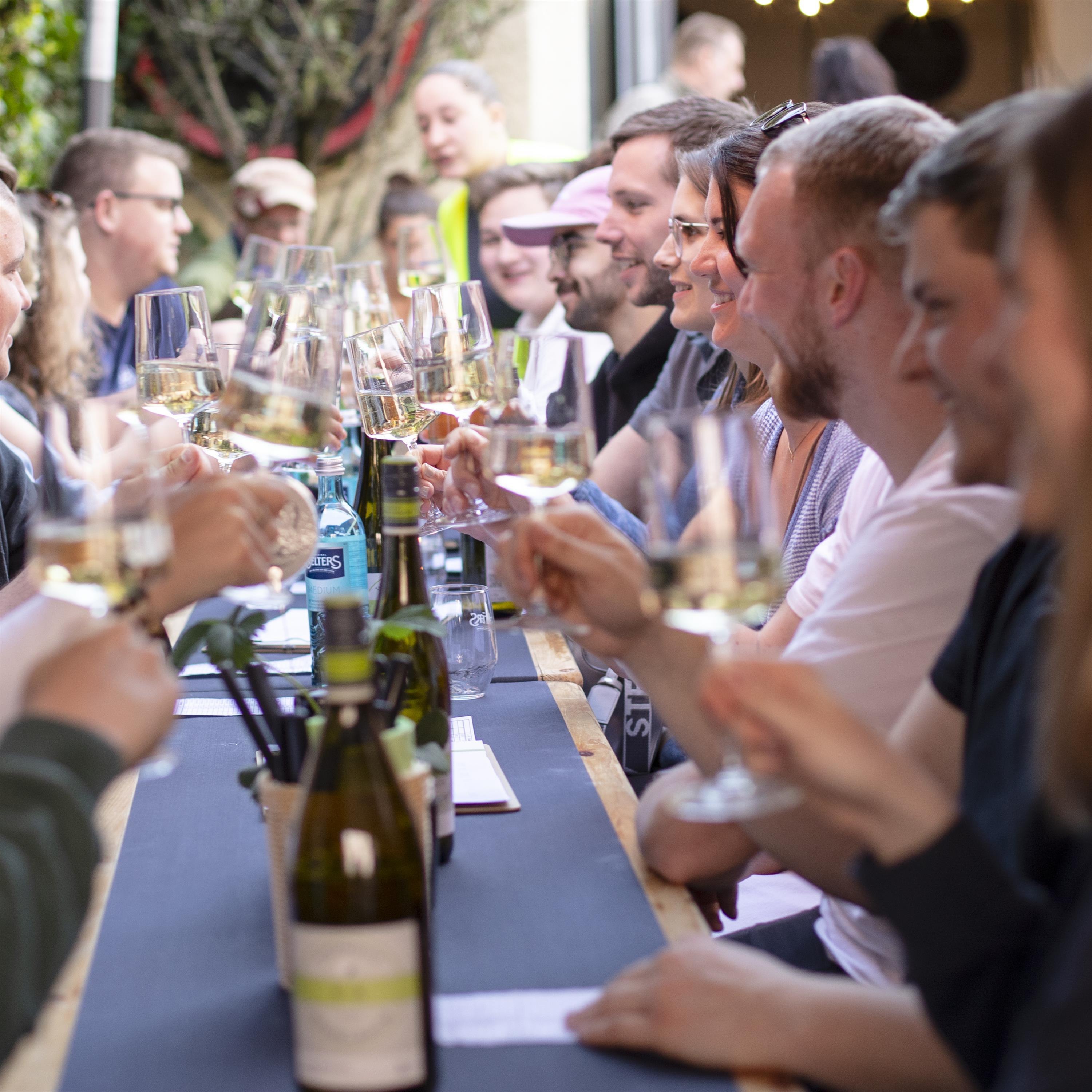 Tipica Straußwirtschaft del Rheingau o también llamada "Heckewirtschaft" en la sala de prensado y en la finca. Pequeños platos regionales desde salchichas de carne hasta platos veganos de lentejas, acompañados de Riesling y vinos Spätburgunder de producción propia.