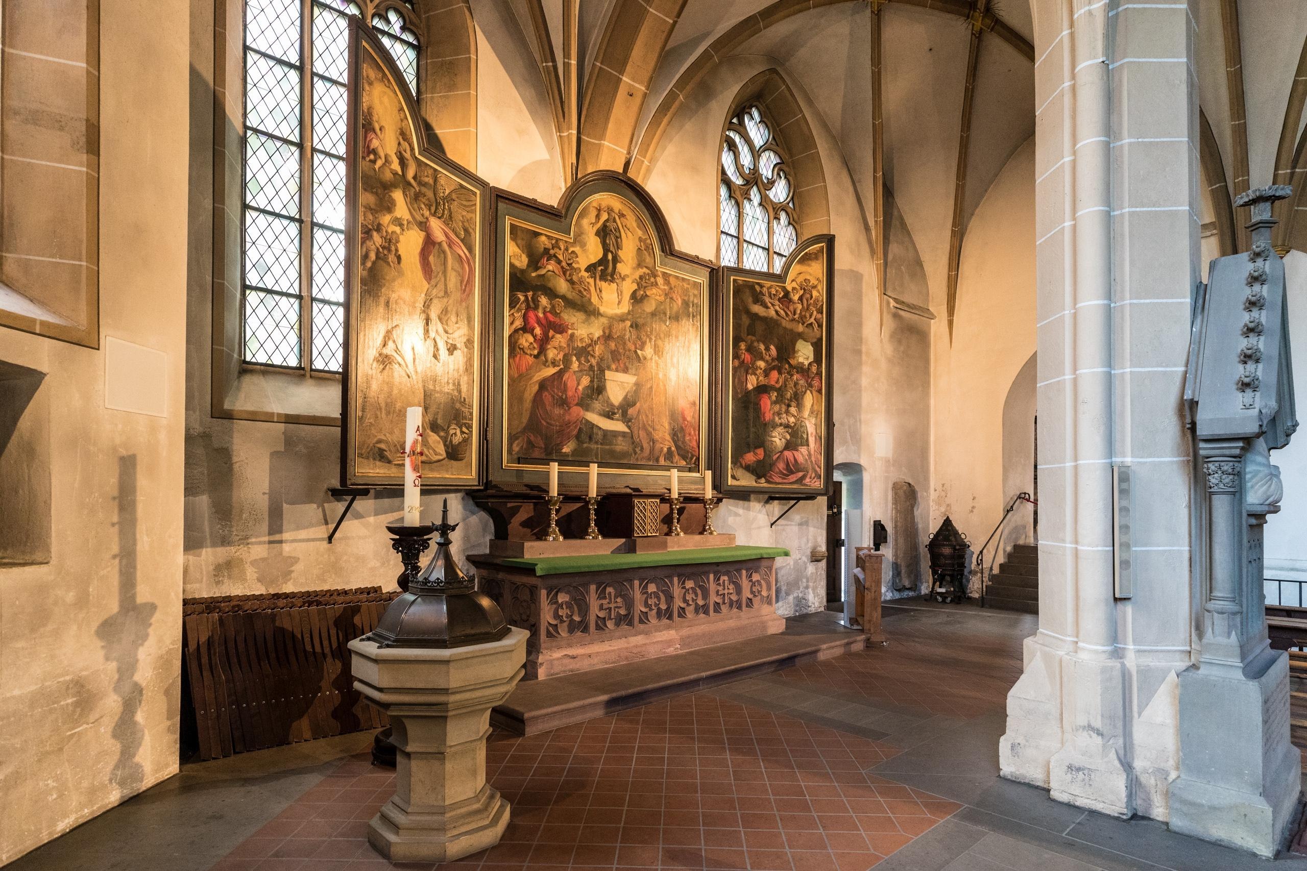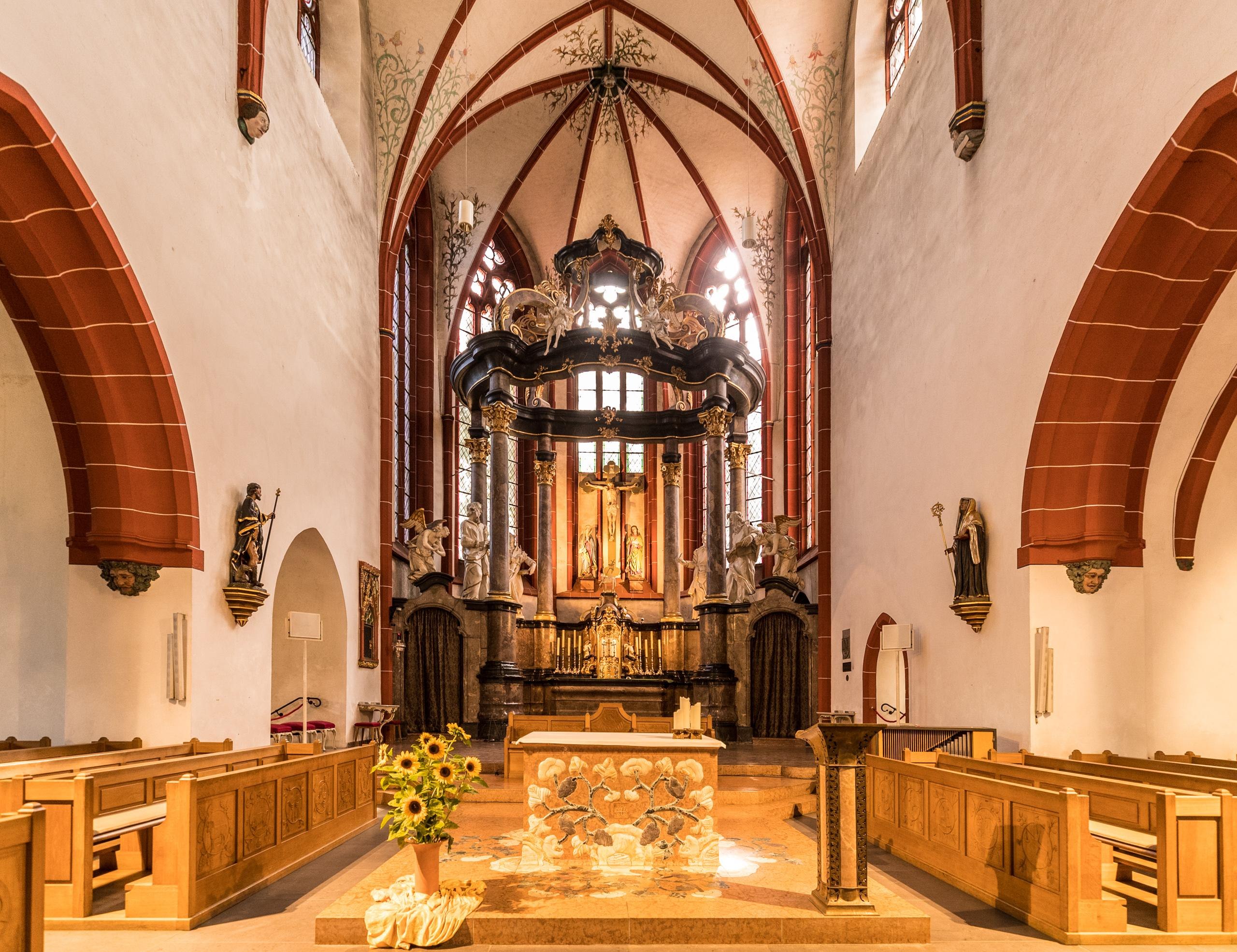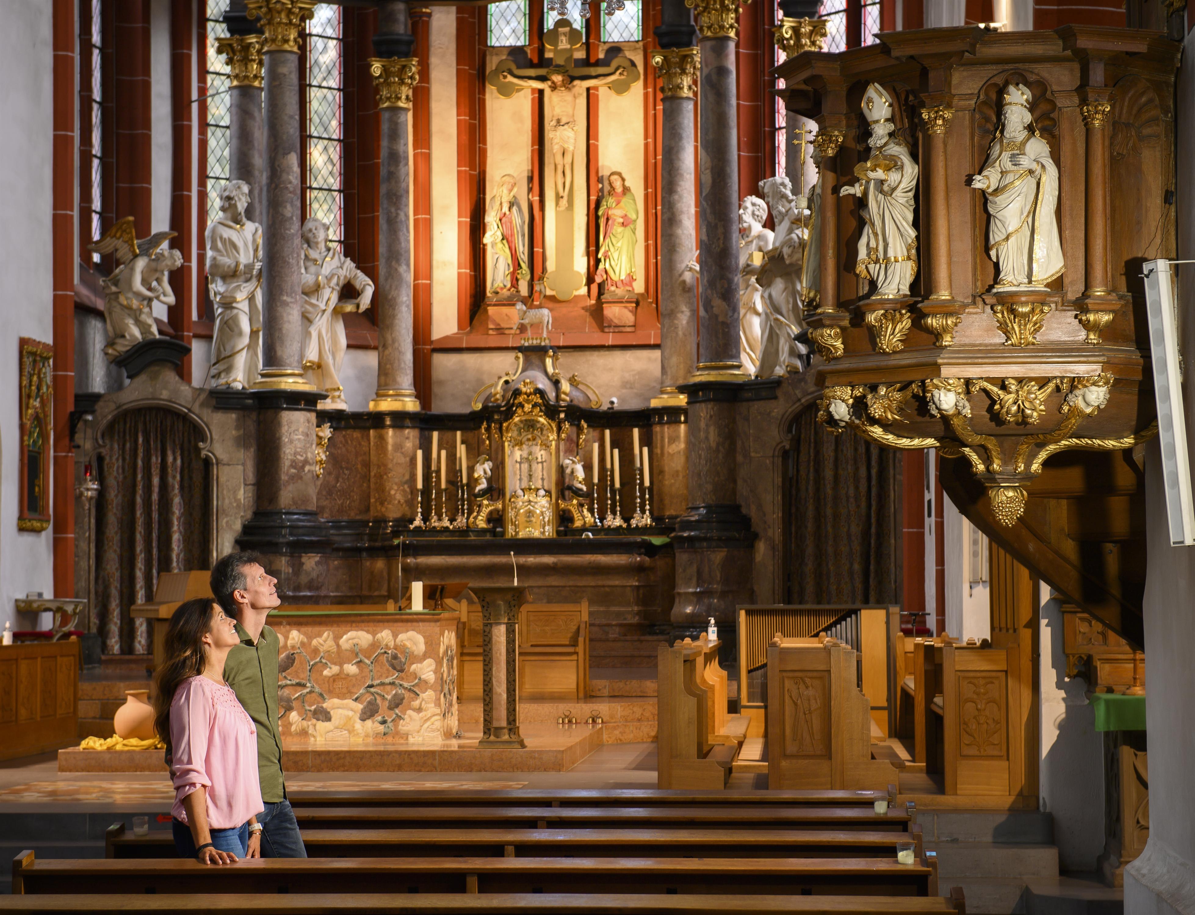 Les pierres tombales attestent qu'il y avait déjà une communauté chrétienne à Bingen au 5ème ou 6ème siècle. Probablement à l'époque franque, l'église paroissiale a été consacrée à saint Martin. Depuis 1006, Saint-Martin est également attesté comme église collégiale, où douze ecclésiastiques sous la direction d'un prévôt exerçaient leur ministère. De la construction romane, il ne reste que la crypte sous le chœur et le clocher sud-ouest. Après le grand incendie de la ville en 1403, la nef actuelle a d'abord été reconstruite. Les bas-côtés ont été ajoutés ultérieurement, dont le côté nord a cependant été remplacé entre 1502 et 1505 par une halle à deux nefs avec voûte étoilée. Ce que l'on appelle le bâtiment Barbara était séparé des autres parties réservées aux chanoines en tant que véritable église paroissiale. En 1817/18, les bâtiments de la collégiale et le cloître devant le portail ouest ont été démolis : la place actuelle vers la Nahe a été créée. En 1885, une restauration soigneuse de l'église a été réalisée par le créateur de la chapelle Rochus, Max Meckel (construction de chapelles latérales et de la sacristie ; galeries en arc-boutant sur les tours). Élevée au rang de basilique par le pape Pie XI en 1930, l'église a été largement détruite par les bombardements en 1944. Après la reconstruction, une rénovation complète a eu lieu entre 1981 et 1988. Le 1er avril 1930, le pape Pie XI a conféré à Saint Martin le titre de basilique papale. Après le bombardement de 1944, la voûte de la nef principale et une partie de l'autel majeur se sont effondrées. Aujourd'hui, les visiteurs peuvent à nouveau s'attendre à un édifice sacré d'une beauté particulière.