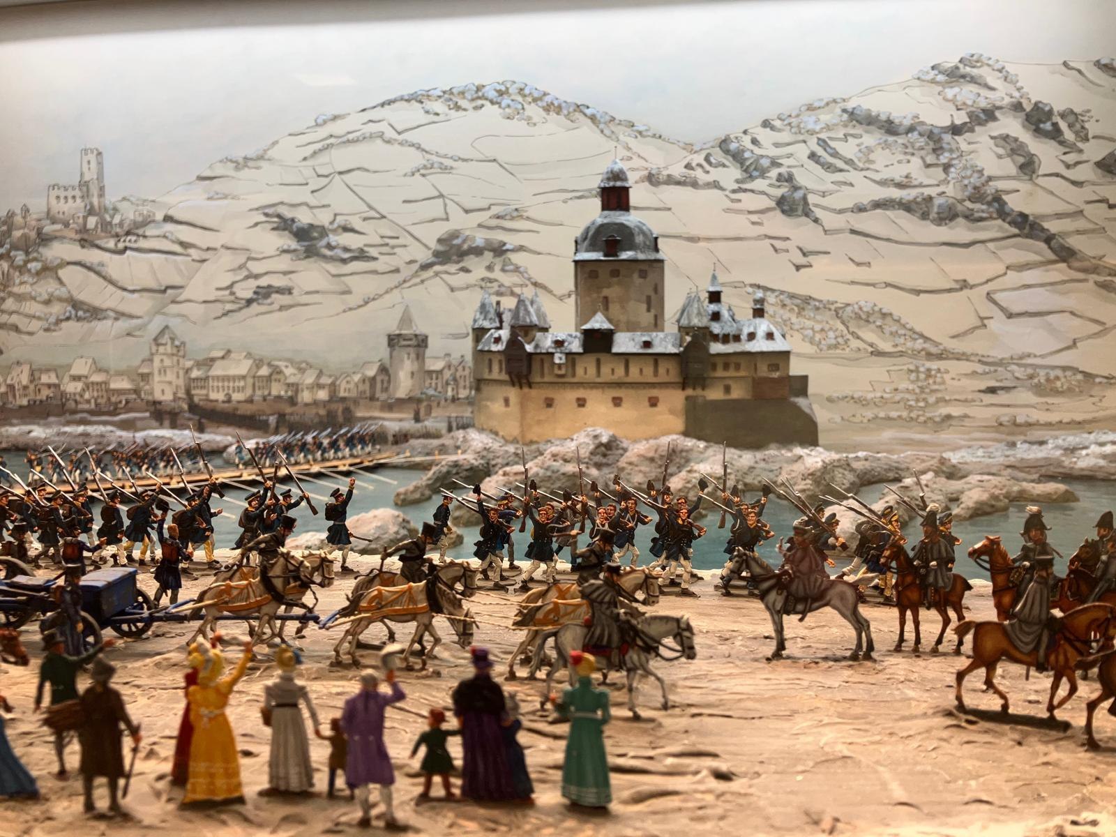 Ce thème est traité de manière exhaustive à travers des souvenirs contemporains, des images et des panneaux d'exposition. Un grand diorama de figurines en étain "La traversée du Rhin par Blücher à Kaub" rapproche particulièrement cet événement historique du visiteur. En outre, il existe d'autres dioramas intéressants.