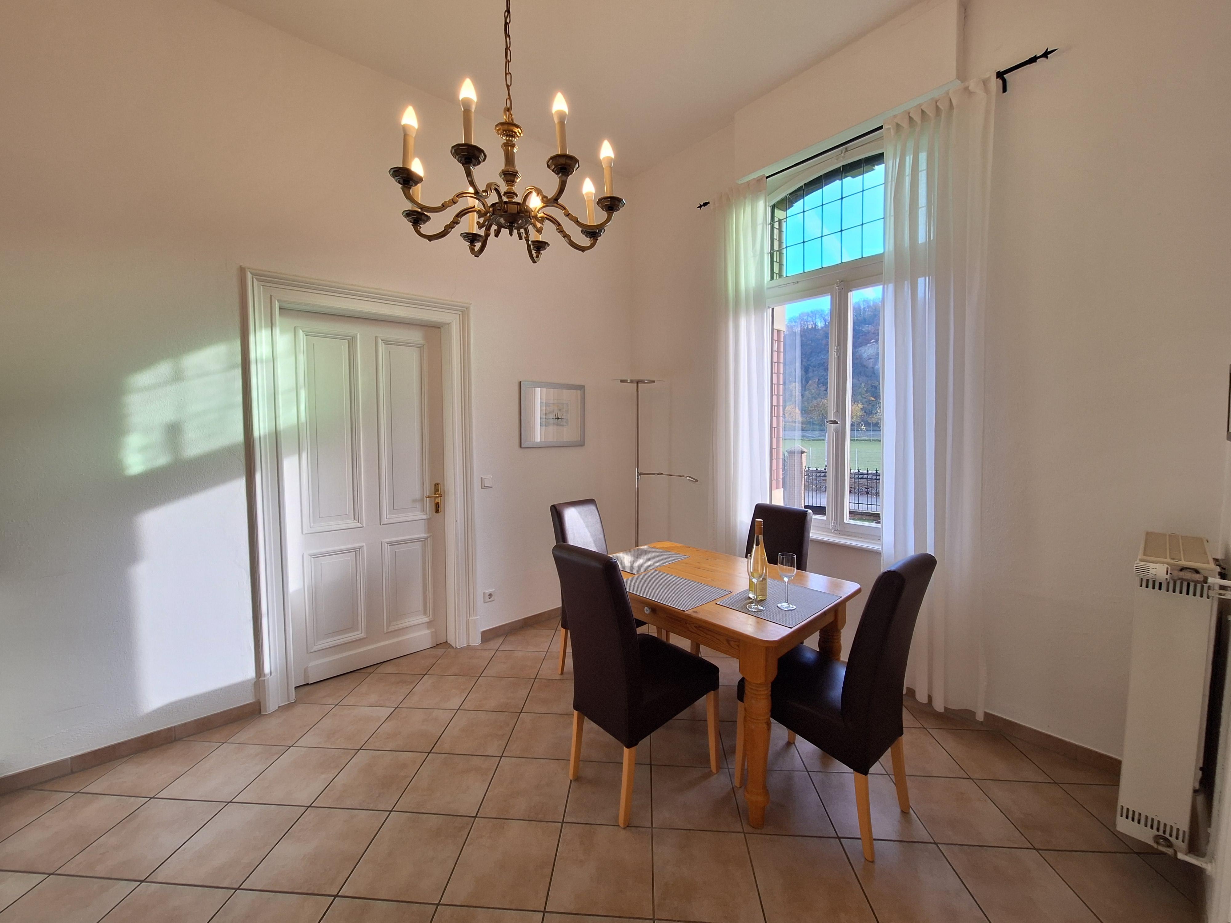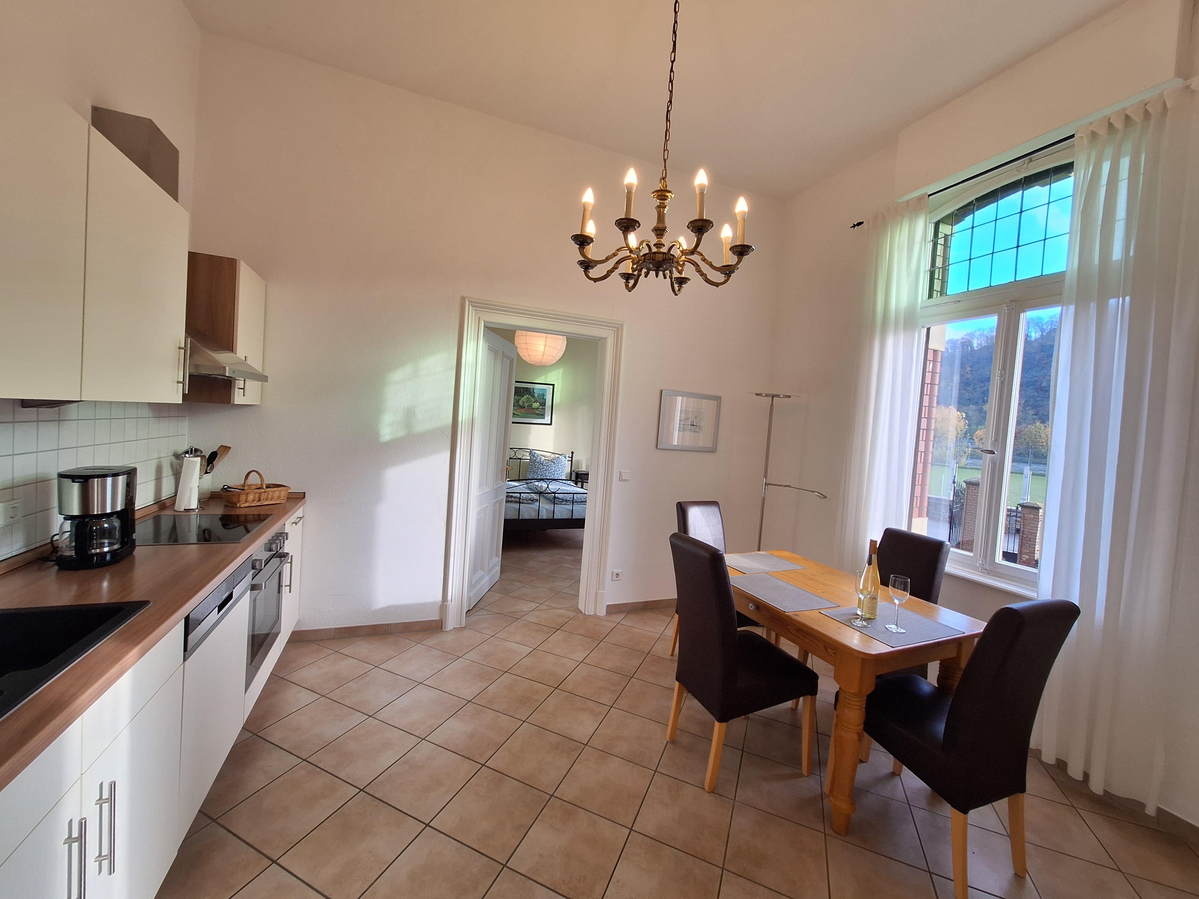 L'appartement non-fumeur, spacieux de 75 m² et entièrement équipé, dispose d'un salon avec bow-window et vue sur le Rhin ainsi que sur la forteresse d'Ehrenbreitstein, d'une télévision par satellite, d'une chaîne stéréo, d'une salle à manger/cuisine avec kitchenette complète et coin repas avec vue sur le Rhin, d'une chambre pour 2 personnes avec vue sur le Rhin ainsi que d'une vaste salle de bain lumineuse côté jardin avec douche à l'italienne. Le couloir/vestiaire est aménagé avec une fenêtre de style Art nouveau et un coin salon supplémentaire.