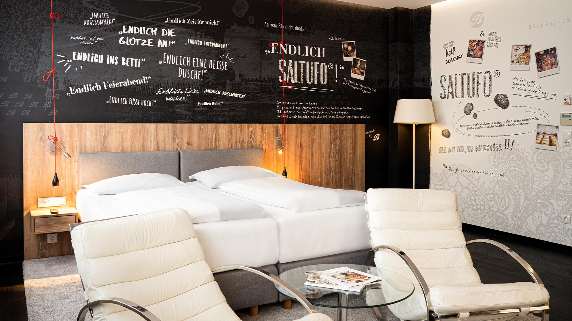 Chacune des 113 chambres de l'hôtel, réparties sur 50 chambres doubles et 63 chambres simples, invite à rêver d'une autre manière. Un point fort particulier sont les 47 chambres à thème supermarché. Chacune a son charme individuel. Chacune est unique. Soigneusement conçue par nos nombreux partenaires variés. Douceur. Salé. Pétillant. Non-alimentaire. Il y en a pour tous les goûts. De Raffaello à Prinzenrolle. De Kölsch à Coca-Cola. Du commerce équitable d'Afrique à REWE et Edeka.