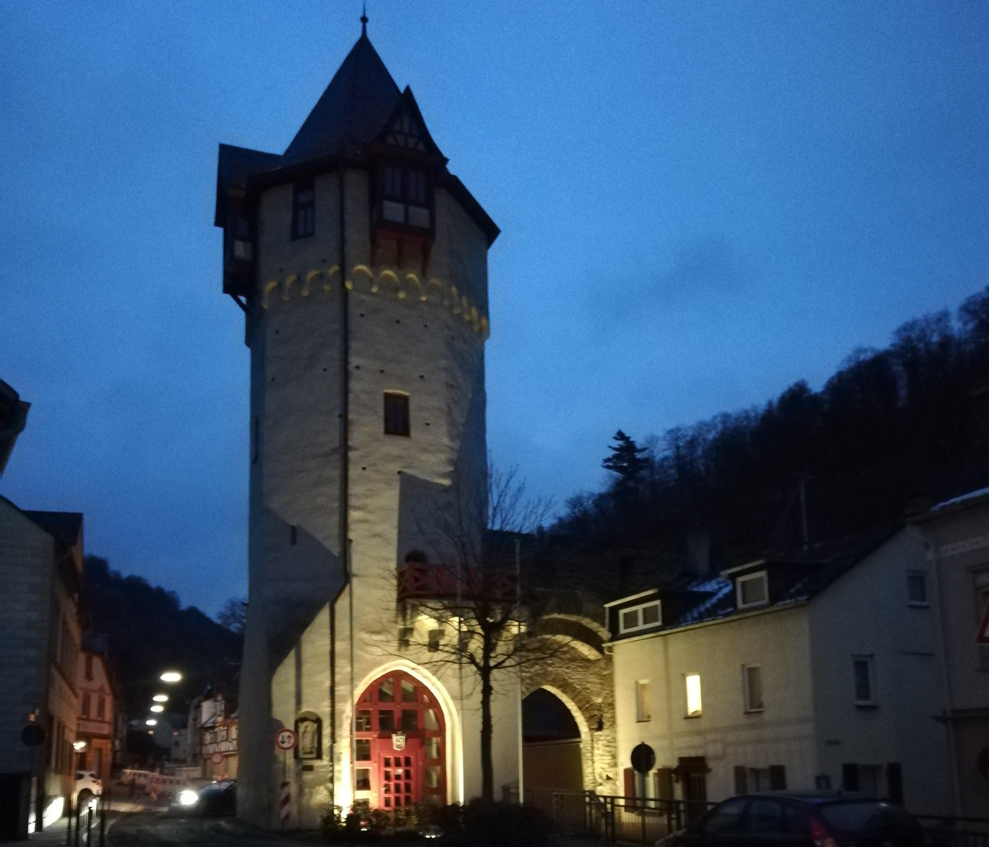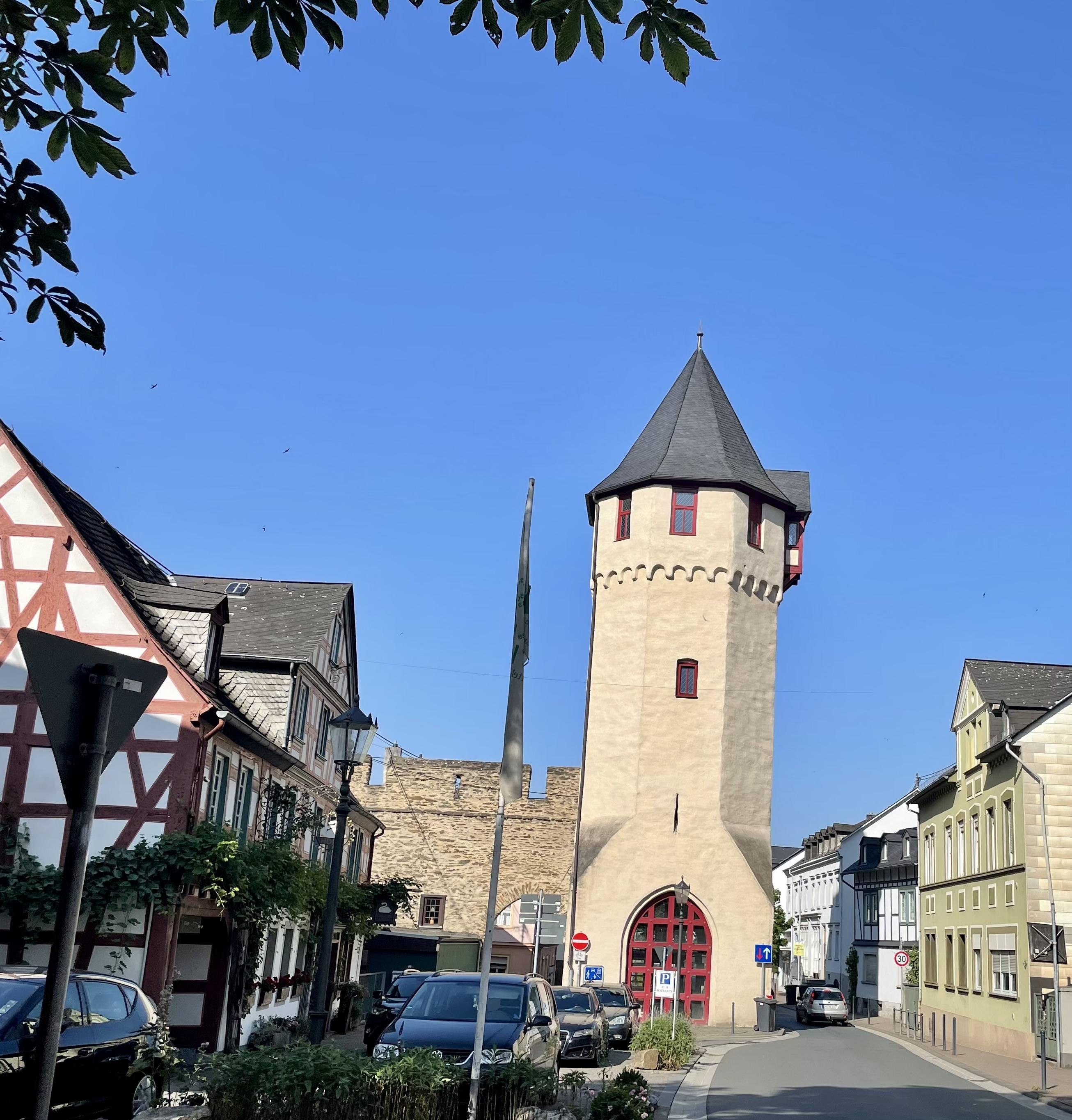 L'enceinte de la ville, qui entourait la partie la plus ancienne de la ville vers 1200, menait de cette tour-porte de l'Unteralleestrasse 28 jusqu'à la colline du château. La porte supérieure était la porte la plus à l'est de l'enceinte de la ville et un point de contrôle important sur la route commerciale vers Wiesbaden. Des parties de l'enceinte de la ville sont visibles entre l'Ober- et l'Unteralleestrasse. L'Obertorturm est l'une des deux anciennes tours de cette région. La tour a subi des modifications vers 1900 lorsqu'un passage dans la tour a été brisé lors de la construction du petit chemin de fer de Nassau. Après que la fonderie de plomb et d'argent ait changé le transport en camions, le petit train a été vendu à la Suisse et l'Obertor a été reconstruit.Aujourd'hui, le trafic circule autour de cette porte.