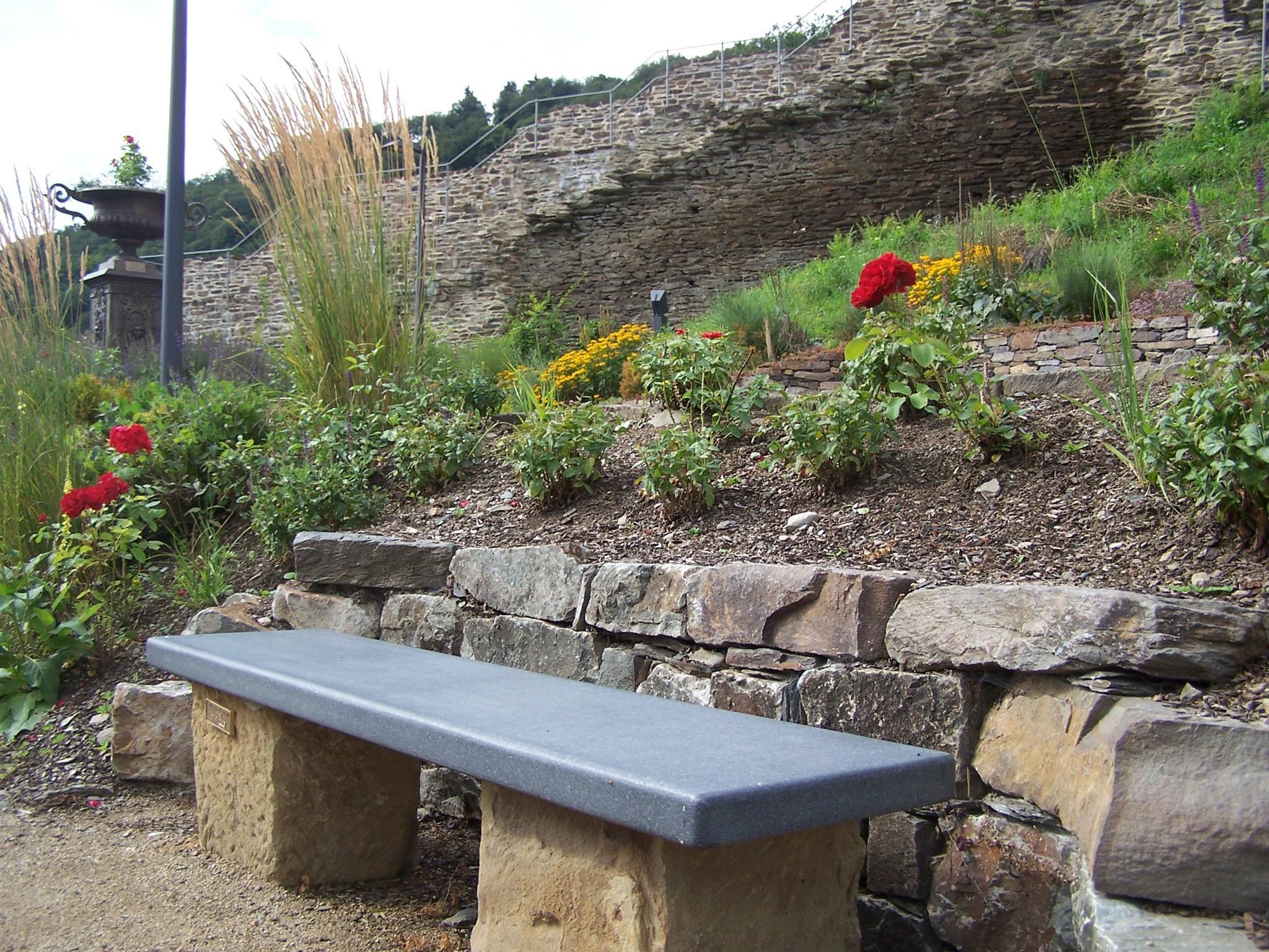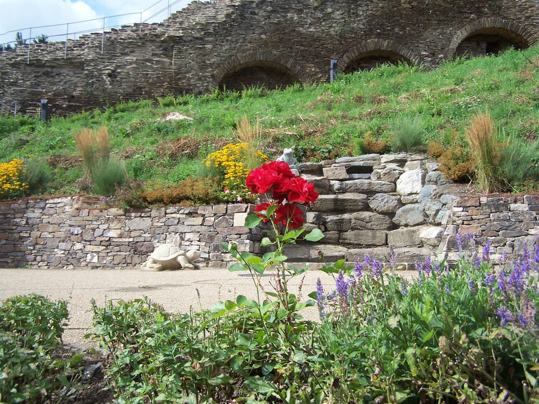 Le mur de la ville d'Oberwesel sur le Michelfeld était particulièrement important pour la défense de la ville, car Oberwesel n'était vulnérable que sur ses côtés terrestres. Elle a donc été soulevée à plusieurs reprises. Cependant, pendant longtemps, le mur d'enceinte de la ville à flanc de montagne n'a pas attiré la même attention de la part des habitants et des touristes que le mur du front du Rhin. C'était un conseil d'initié pour les connaisseurs. Cela a changé lorsque le "Bauverein Historische Stadt Oberwesel e.V." a rénové le mur ouest de la ville morceau par morceau. Surtout quand la ville a aménagé un jardin à ses pieds. Dans le jardin des murs de la ville, on trouve des arbustes à fleurs, des plantes vivaces, des roses et un jardin d'herbes médicinales. Ce mélange "coloré" a créé un jardin public devant l'impressionnante toile de fond de la muraille historique et praticable de la ville. Les nombreux bancs vous invitent à vous attarder. Le jardin peut être découvert sans obstacle. Mais si vous le souhaitez, vous pouvez essayer les impressionnants escaliers. Un jardin très intéressant sur le mur historique de la ville. Le jardin est ouvert toute l'année jusqu'à la tombée de la nuit.