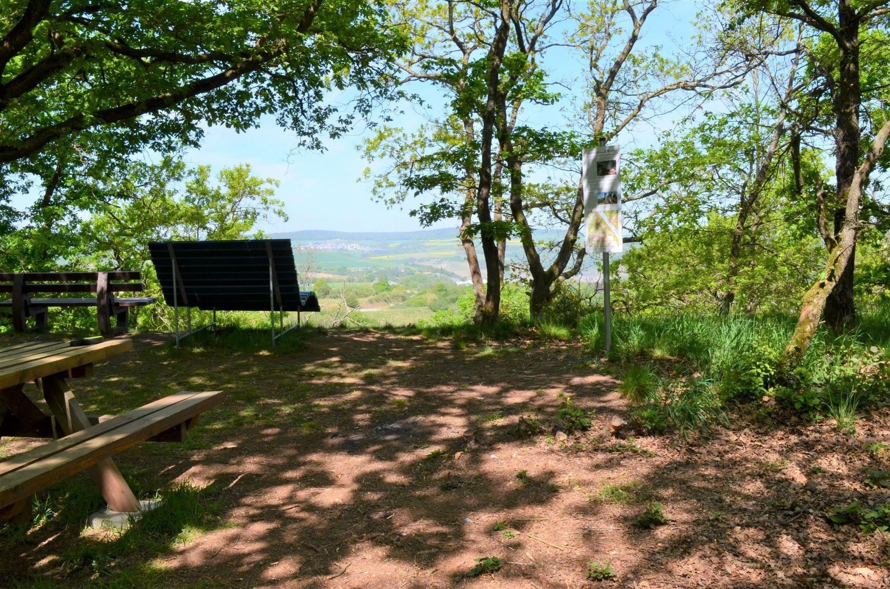 Prachtige rustplaats met verschillende zitmogelijkheden, een bank en een tafelgroep. Grandioos ver uitzicht in de Rijnvallei. Parkeren bij het buurthuis in Langscheid, op ca. 1 km afstand. Direct gelegen aan de droomlus "Pfalzblick".
