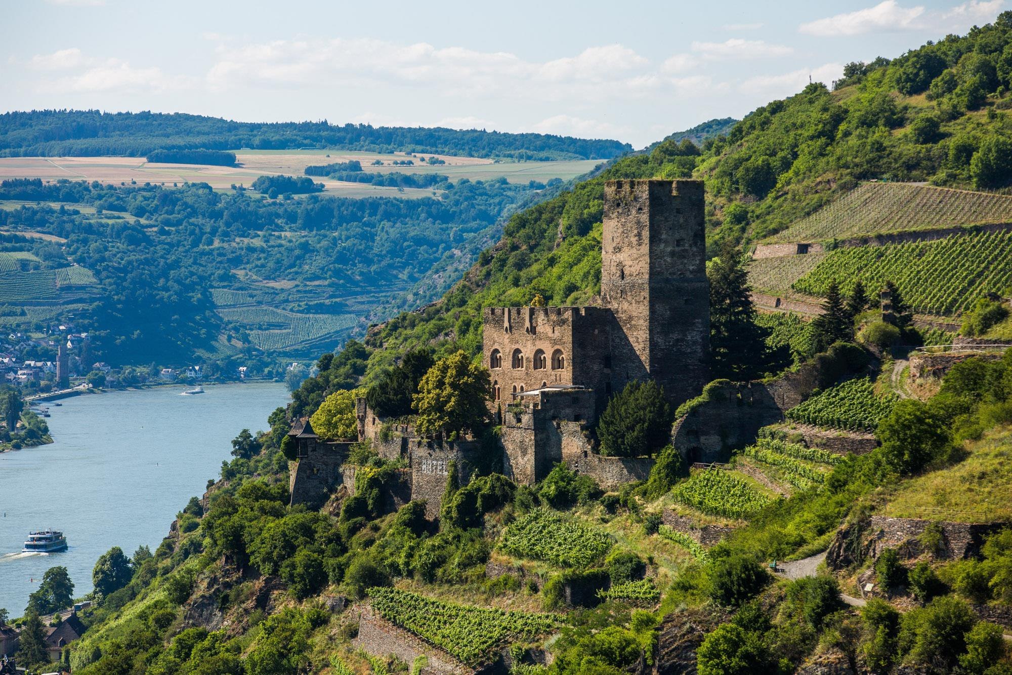 Omgeven door wijngaarden ligt het Burghotel boven Kaub.